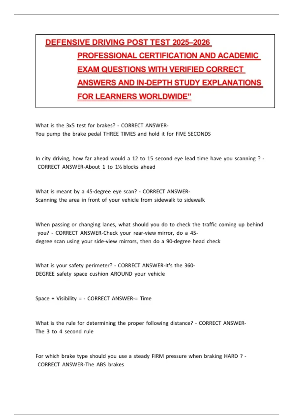 This document provides the complete 2025–2026 Defensive Driving Post Test for professional certification and academic evaluation. It includes verified correct answers with detailed study explanations covering safe driving techniques, traffic regulations, accident prevention, and defensive driving strategies. Ideal for learners, instructors, and professionals preparing for post-course assessments or certification renewal in defensive driving programs worldwide.