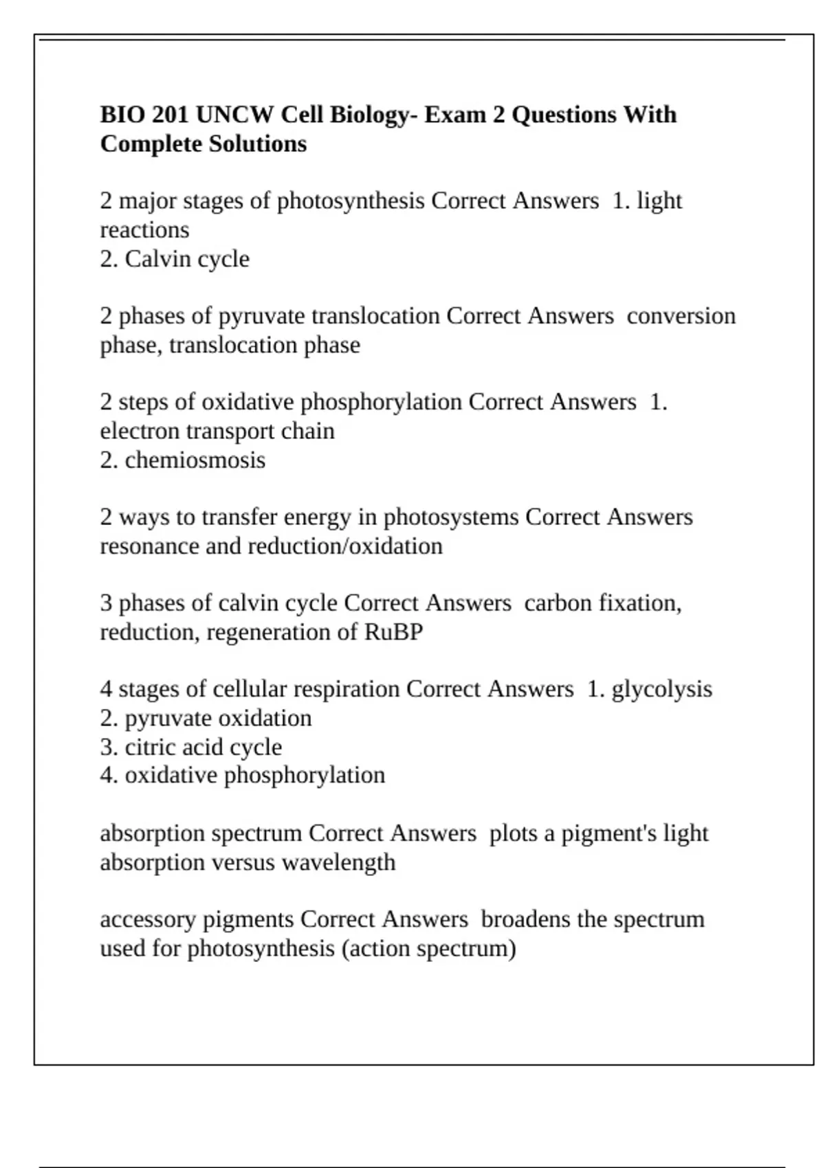BIO 201 UNCW Cell Biology- Exam 2 Questions With Complete Solutions