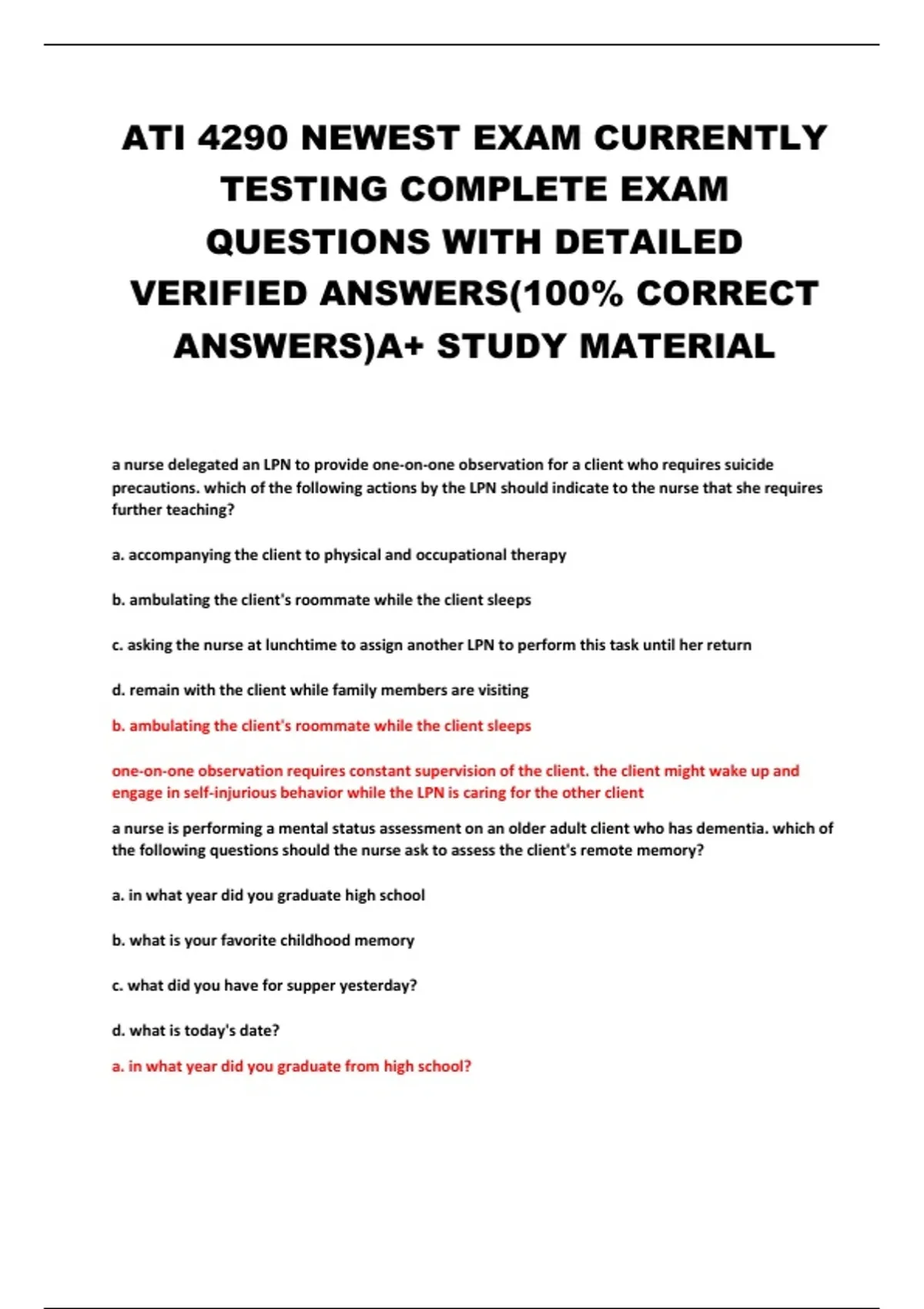 ATI 4290 NEWEST EXAM CURRENTLY TESTING COMPLETE EXAM QUESTIONS WITH DETAILED VERIFIED ANSWERS(100% CORRECT ANSWERS)A+ STUDY MATERIAL