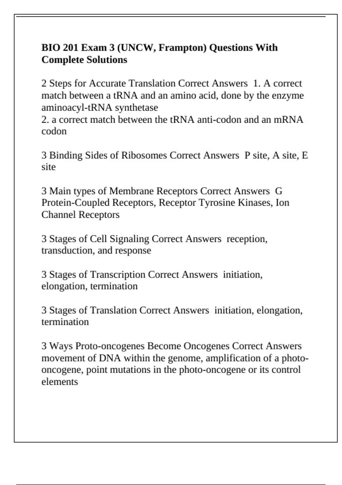 BIO 201 Exam 3 (UNCW, Frampton) Questions With Complete Solutions