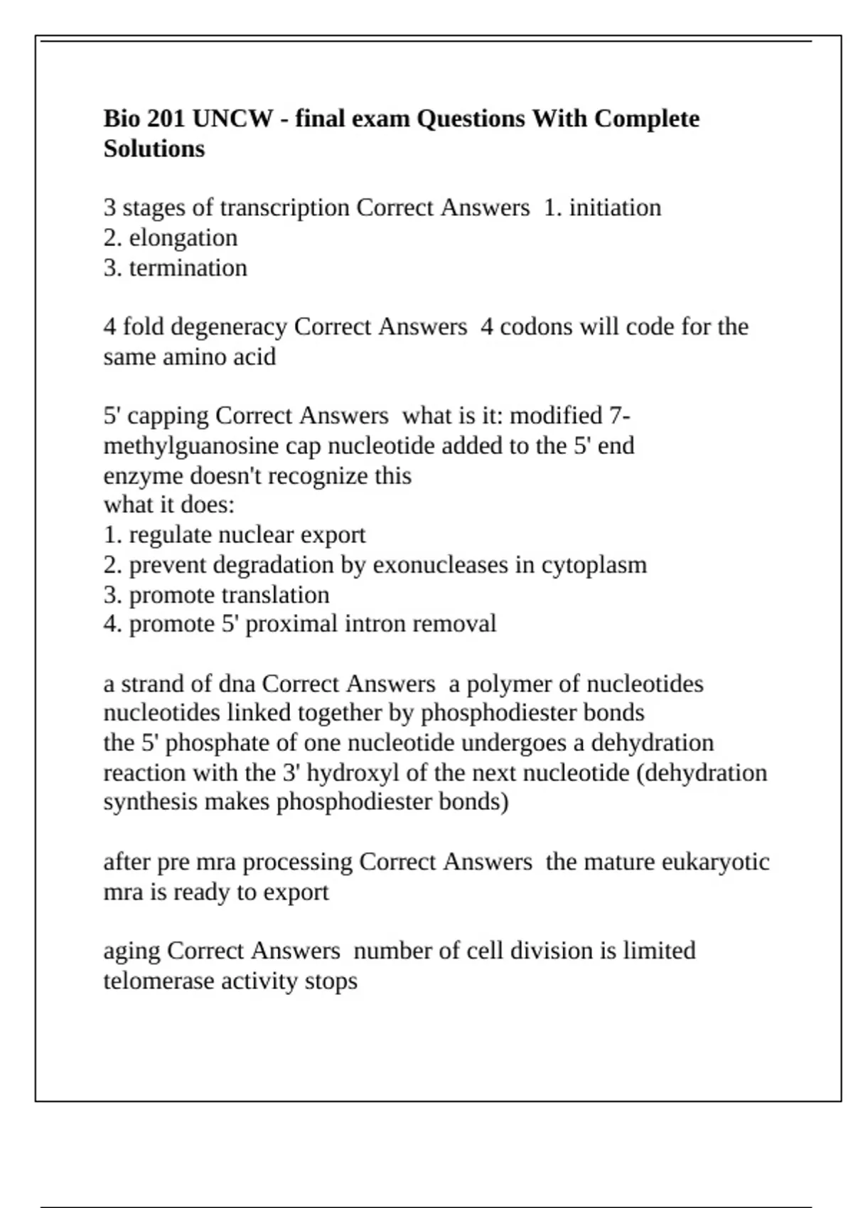 Bio 201 UNCW - final exam Questions With Complete Solutions