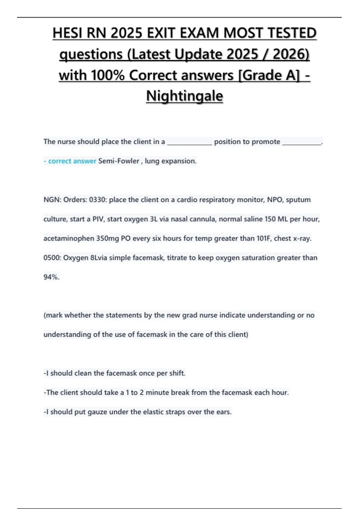 HESI RN 2025 EXIT EXAM MOST TESTED questions (Latest Update 2025 / 2026) with 100% Correct answers [Grade A] - Nightingale