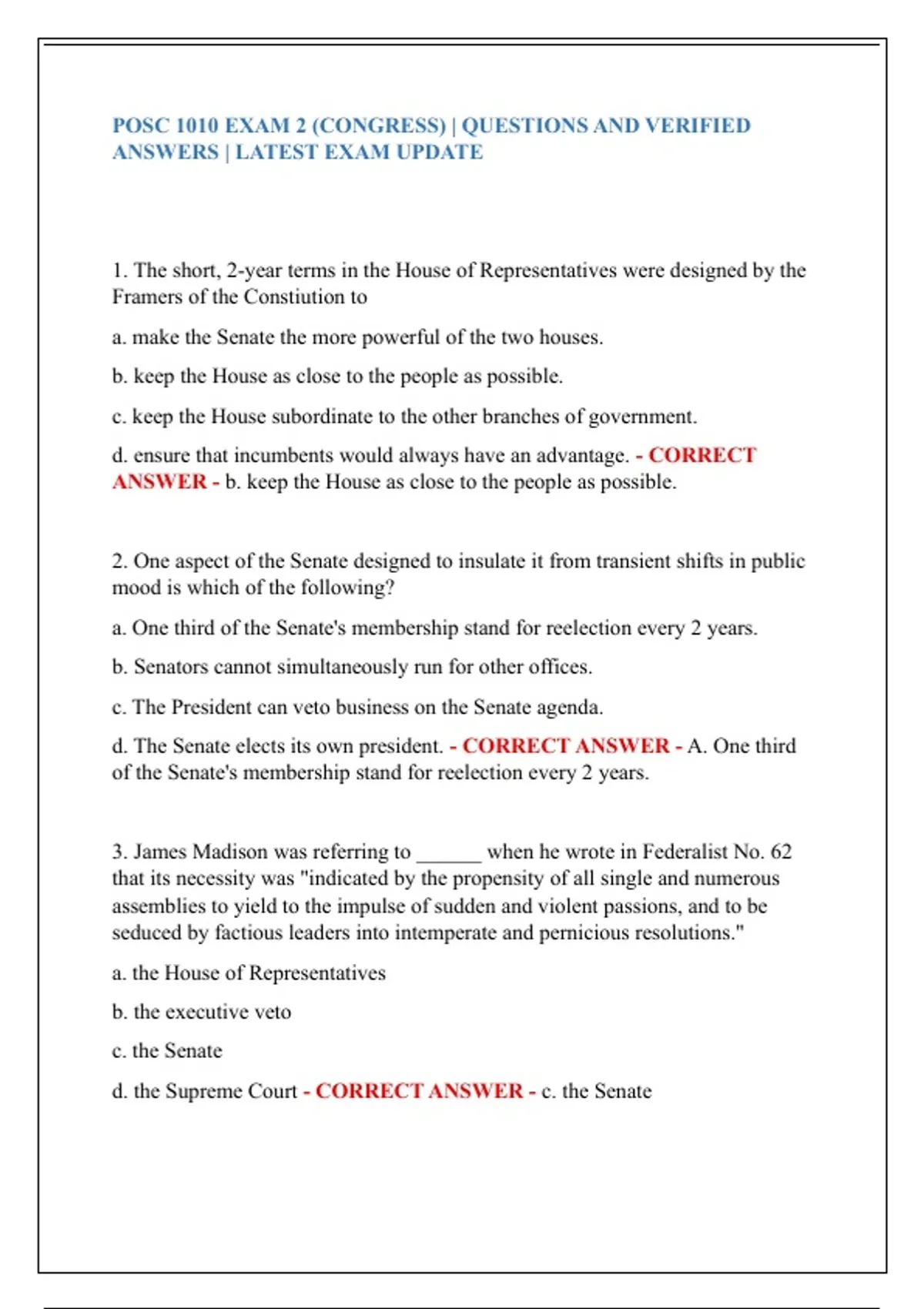 POSC 1010 EXAM 2 (CONGRESS) | QUESTIONS AND VERIFIED