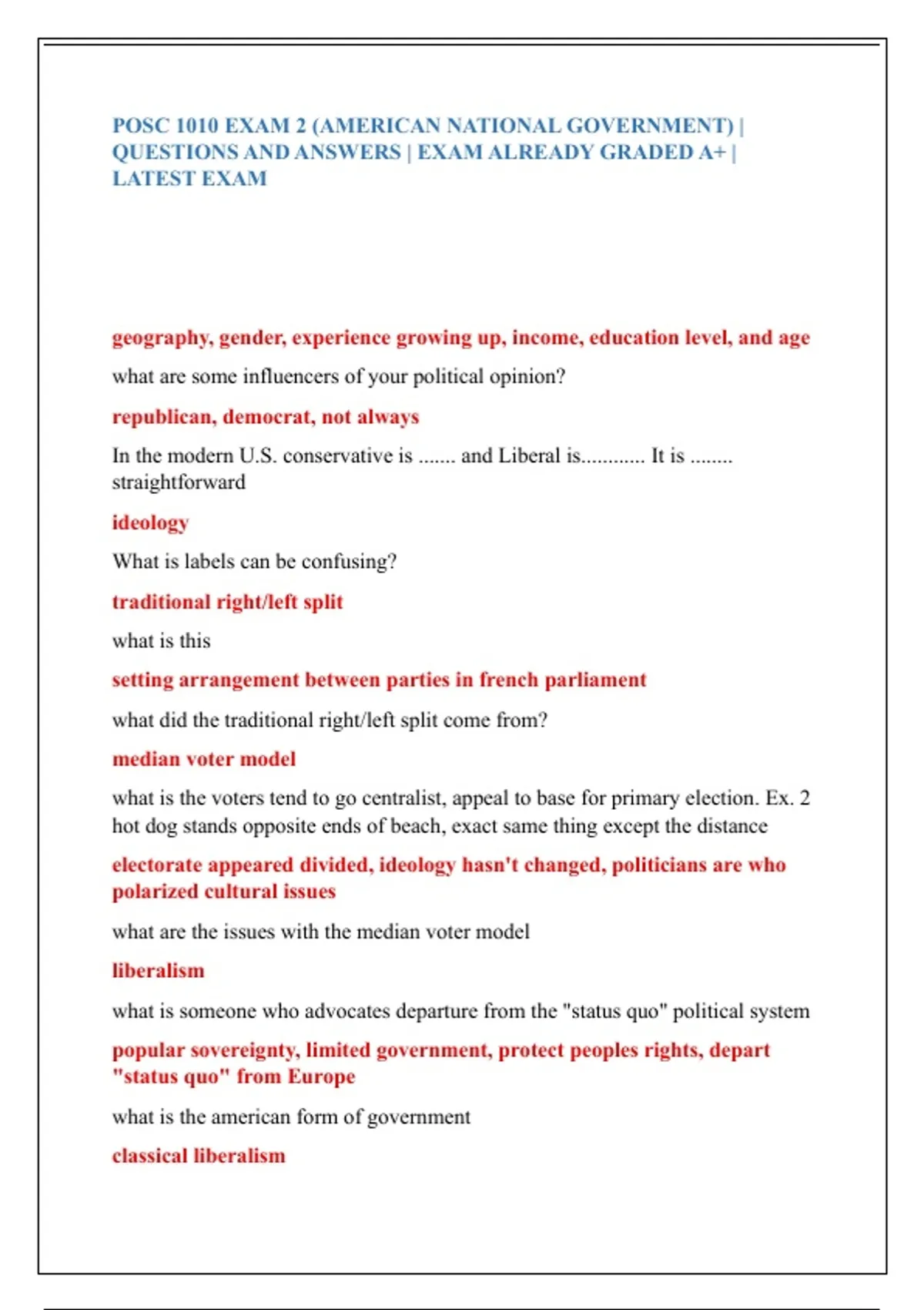 POSC 1010 EXAM 2 (AMERICAN NATIONAL GOVERNMENT) | QUESTIONS AND ANSWERS | EXAM ALREADY GRADED A+ | LATEST EXAM