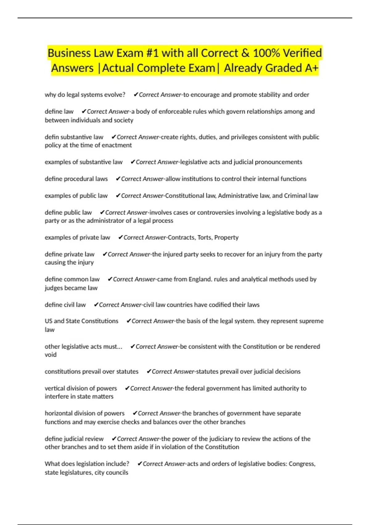 Business Law Exam #1 with all Correct & 100% Verified Answers |Actual Complete Exam| Already Graded A+