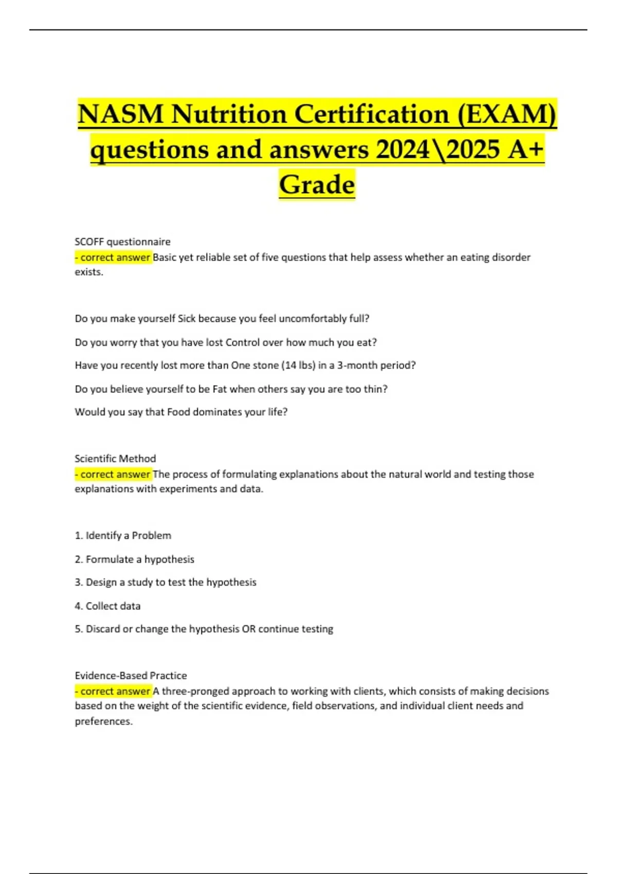 The NASM Nutrition Certification Exam (2024/2025 Edition) is a verified, A+ graded study guide with actual exam-style questions and detailed correct answers. It covers macronutrients, micronutrients, hydration, metabolism, supplementation, and behavior change strategies, ensuring candidates are fully prepared to pass the NASM Nutrition Certification exam.The NASM Nutrition Certification (NASM-CNC) equips fitness professionals with evidence-based knowledge in nutrition science and coaching. This verified study resource provides real exam-style questions with detailed rationales, already graded A+, making it a trusted prep tool for guaranteed success. Learning Outcomes: Understand macronutrients (carbohydrates, proteins, fats) and their caloric values. Apply knowledge of micronutrients (vitamins, minerals) to health and performance. Recognize the importance of hydration and electrolyte balance. Explain metabolism and energy systems (ATP-PC, glycolysis, oxidative). Provide guidance on supplementation within scope of practice