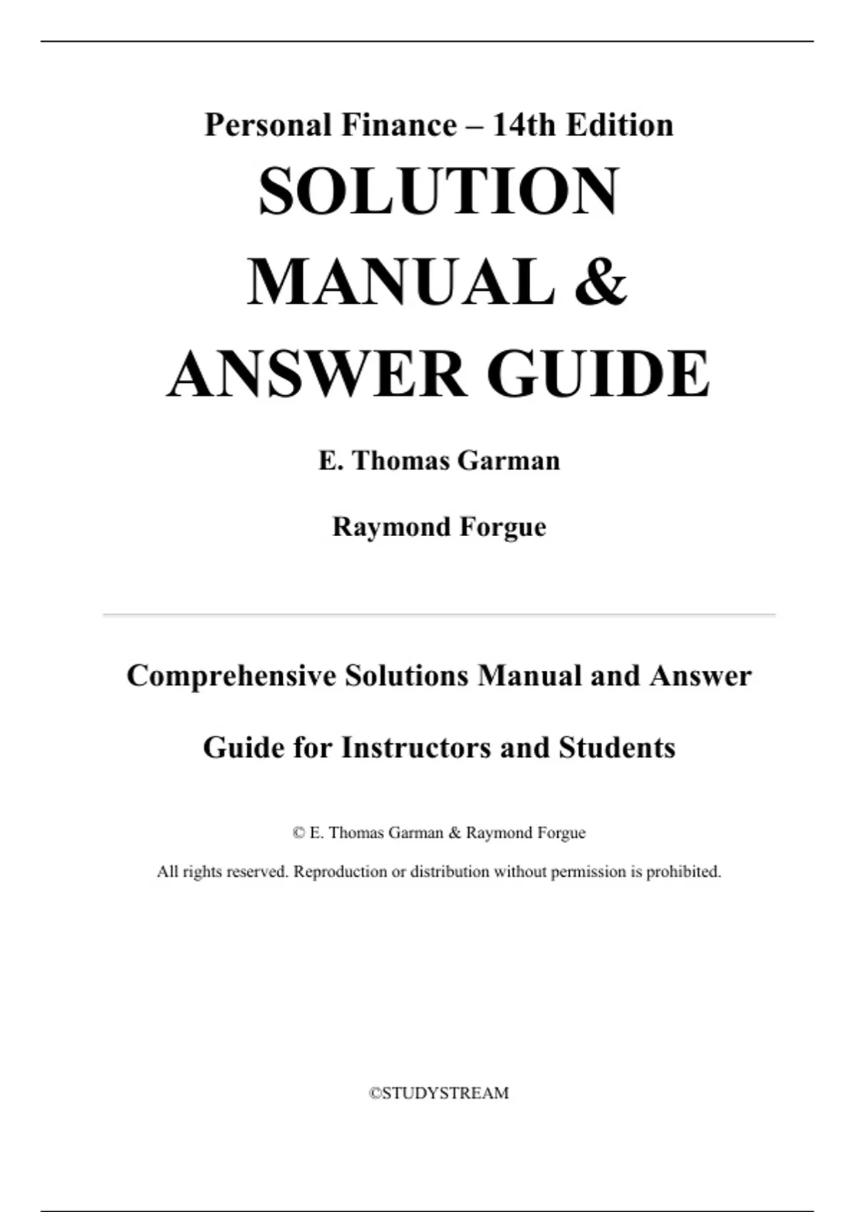 This document provides the full solution manual and answer guide for Personal Finance (14th Edition) by E. Thomas Garman. It includes complete, step-by-step answers to all end-of-chapter questions, problems, and case studies across all topics. Covered material includes financial planning, budgeting, credit management, saving and investing, insurance, taxes, retirement planning, and estate planning. Designed to reinforce textbook concepts with practical problem-solving support, this resource is ideal for students in finance, business, or personal money management courses.