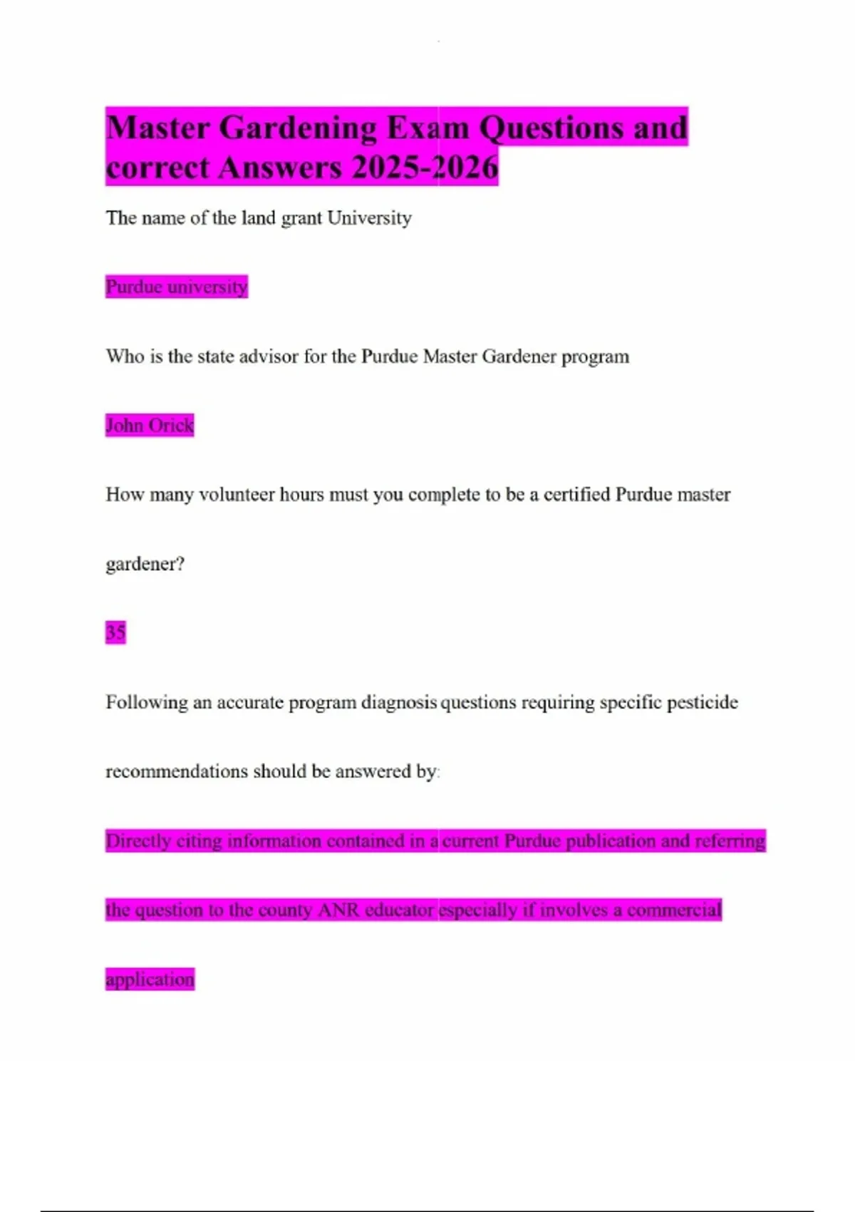 Master Gardening Exam Questions and correct Answers The name of the land grant University Purdue university Who is the state advisor for the Purdue Master Gardener program John Orick How many volunteer hours must you complete to be a certified Purdue master gardener? 35 Following an accurate program diagnosis questions requiring specific pesticide recommendations should be answered by: Directly citing information contained in a current Purdue publication and referring the question to the county ANR educator especially if involves a commercial applicationTrue or false you should endorse or encourage the use of specific products by brand names F True or false you should provide a variety of opinions where possible so the homeowner may make their own decision in their choice of pest control or production techniques T A process a plant uses to convert water carbon dioxide and light energy into carbohydrates to be used by the plant as food