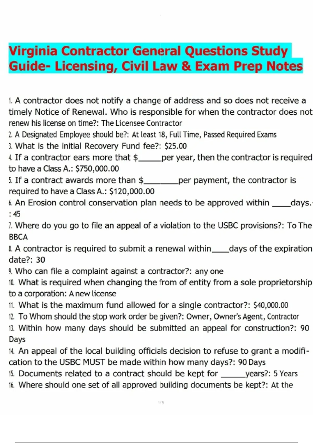 Virginia Contractor General Questions Study Guide- Licensing, Civil Law & Exam Prep Notes.pdf