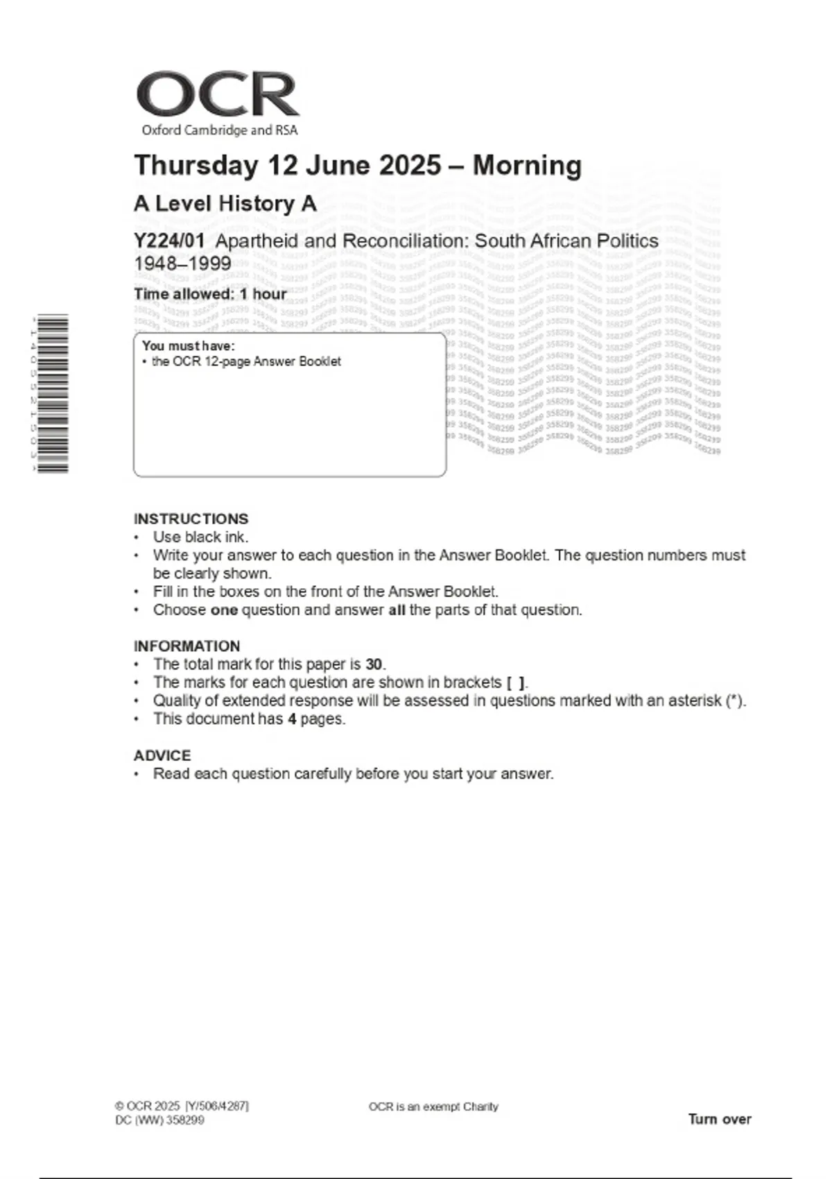 OCR A Level History A Y224/01 Apartheid and Reconciliation: South African Politics 1948–1999 Combined Question Paper & Final Marking Scheme 2025