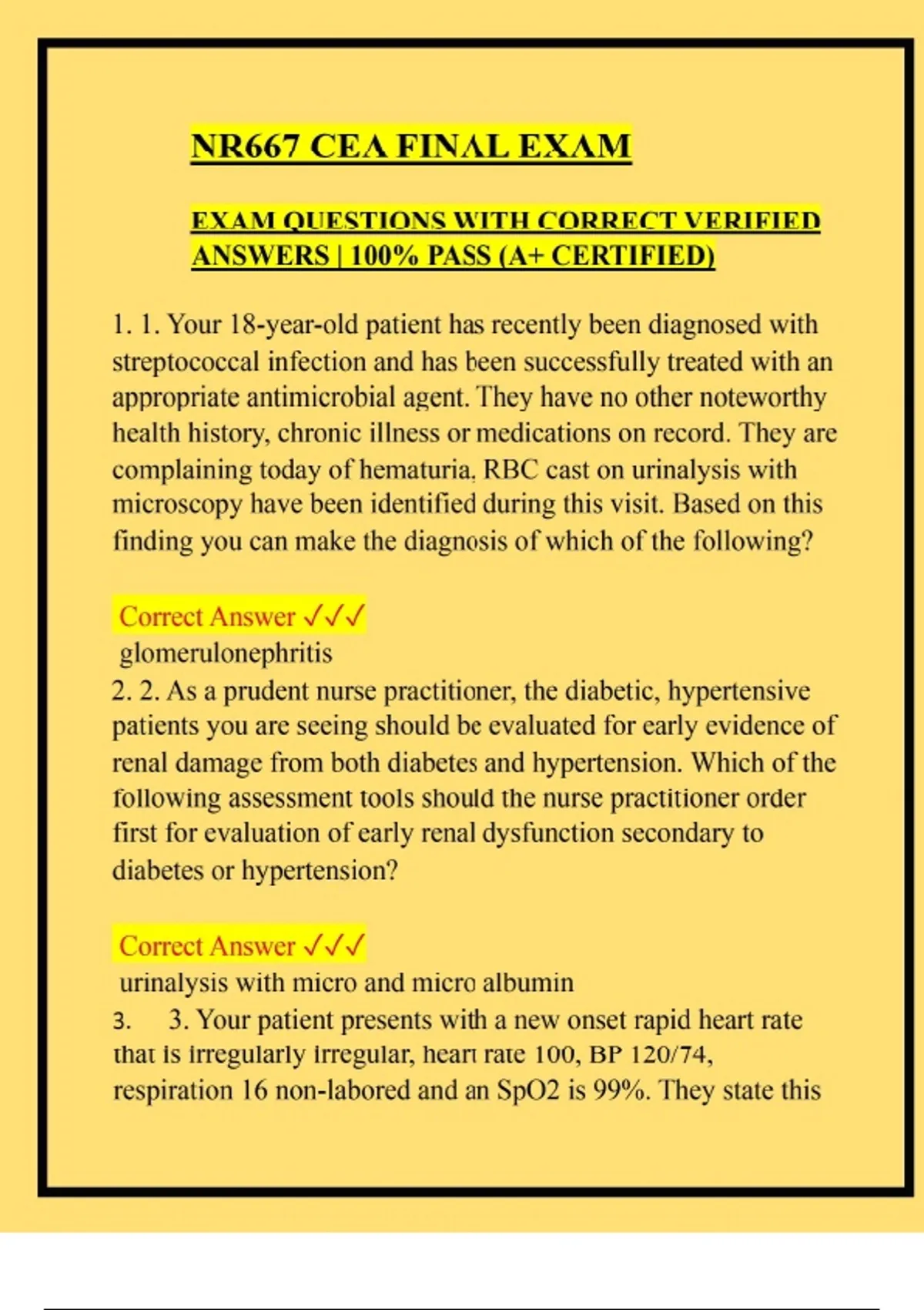 NR667 CEA FINAL EXAM EXAM QUESTIONS WITH CORRECT VERIFIED ANSWERS | 100% PASS (A+ CERTIFIED) 1. 1. Your 18-year-old patient has recently been diagnosed with streptococcal infection and has been successfully treated with an appropriate antimicrobial agent. They have no other noteworthy health history, chronic illness or medications on record. They are complaining today of hematuria, RBC cast on urinalysis with microscopy have been identified during this visit. Based on this finding you can make the diagnosis of which of the following? Correct Answer glomerulonephritis 2. 2. As a prudent nurse practitioner, the diabetic, hypertensive patients you are seeing should be evaluated for early evidence of renal damage from both diabetes and hypertension. Which of the following assessment tools should the nurse practitioner order first for evaluation of early renal dysfunction secondary to diabetes or hypertension? Correct Answer urinalysis with micro and micro albumin 3. 3. Your patient presents with a new onset rapid heart rate that is irregularly irregular, heart rate 100, BP 120/74, respiration 16 non-labored and an SpO2 is 99%. They state this has been going on for a week or so intermittently, but for the past four days straight it hasn't stopped. Your first priority intervention for this patient is to do which of the following? Correct Answer maintain rate control and anticoagulation prior to rhythm conversion 4. 4. As a prudent nurse practitioner, you know that a 28-year old male patient with HIV would be considered well managed when they have which of the following in addition to having undetectable or very low viral copies? Correct Answer CD4 count of 500 5. 5. Your patient has expressed concern about a skin lesion which you identify as a darkened, round, and raised lesion. This benign lesion that appears like "stuck on" to the skin. Which of the following lesions best fits this description?- Correct Answer Seborrheic keratosis 6. 6. You are treating a patient who has stopped taking their diuretic regimen against medical advice while they were on vacation since it made them urinate too frequently for their plans. Now they are 21 pounds heavier than their baseline weight, have respiratory crackles in bilateral bases, and have severe generalized lower extremity and truncal edema extending to the sacrum and abdomen. On your documentation, this is referred to as which of the following conditions? Correct Answer Anasarca 7. 7. While evaluating a patient in your clinic for a routine health visit, you auscultate crackles in the posterior left lower lobe, have the patient cough, with follow-up auscultation revealing clear breath sounds. Which one of the following would you suspect? Correct Answer Atelectasis 8. 8. Gladys is a 72-year-old patient with a history of anemia of chronic disease from kidney failure, diabetes mellitus, and hypothyroidism, presents today with concerns her thyroid medication is not working well enough. Her most recent labs reflect her TSH is 5.9 (normal range 0.5-5 uU/mL) and Free T4 is 0.3 ng/dL (normal range 0.8-2.8 ng/dL). Which one of the following clinical signs and/or symptoms would you expect a patient with these findings to present with? Correct Answer cold intolerance 9. 9. You are examining the mouth of a patient and ask the patient to stick out their tongue and notice that the tongue deviates by pointing to the left. Which one of the following is the correct diagnosis of this finding? Correct Answer cranial nerve XII (hypoglossal nerve) lesion on the left 10. 10. Your 31-year-old female patient states they are experiencing lateral lower back pain and urinalysis reveals bacteria in the urine, culture reveals gram negative rods after 24 hours of growth. Which of the following is least likely agent to cause her urinary tract infection? Correct Answer Enterococcus 11. Marvin, your 47-year-old African American patient with a diagnosis of severe COPD and coronary artery disease has been complaining of shortness of breath and wheezing after initiation of a new medicine for his coronary artery disease management. Given his health history which of the following agents is considered the safest beta blocker for his CAD management? Correct Answer Lopressor 12. Melissa, your 56-year-old Caucasian female patient presents with a health history of hypertension, migraines, hyperlipidemia, seasonal depression and obesity for a visit to establish care. She was without any medical care for a long time and being newly established to your clinic is prescribed aspirin 81 mg daily, atorvastatin 40 mg daily, betide 10 mg daily, lisinopril 20 mg daily, amlodipine 10 mg daily, and Wellbutrin 300 mg daily as well as diet and exercise. After the visit she calls your office nurse and states she has been experiencing considerably lower extremity edema and constipation since starting these medicines after your visit. Which of the pharmacology agents she is prescribed is most likely the common cause of the side effects? Correct Answer Norvasc 13. Sarah, a 28-year-old female patient presented to your clinic with wheezing and despite being treated with nebulized medication is not having any relief. You believe she is experiencing status asthmaticus. As a prudent nurse practitioner, you recall that she may benefit from IM injection of which of the following agents? Correct Answer Terbutaline 14. Your 72-year-old female patient with a pertinent medical history of coronary artery bypass graft and aortic valve replacement seven years ago with a porcine bioprosthetic valve has been previously stable on their medical regimen. Today she complains of near syncope when standing, which she states has been getting worse over the past six months but failed to tell anyone as she felt it was just part of natural aging and taking medications. Your workup should include evaluation of which of the following potential cardiac complications? Correct Answer Bioprosthetic aortic valve stenosis 15. During a post hospi