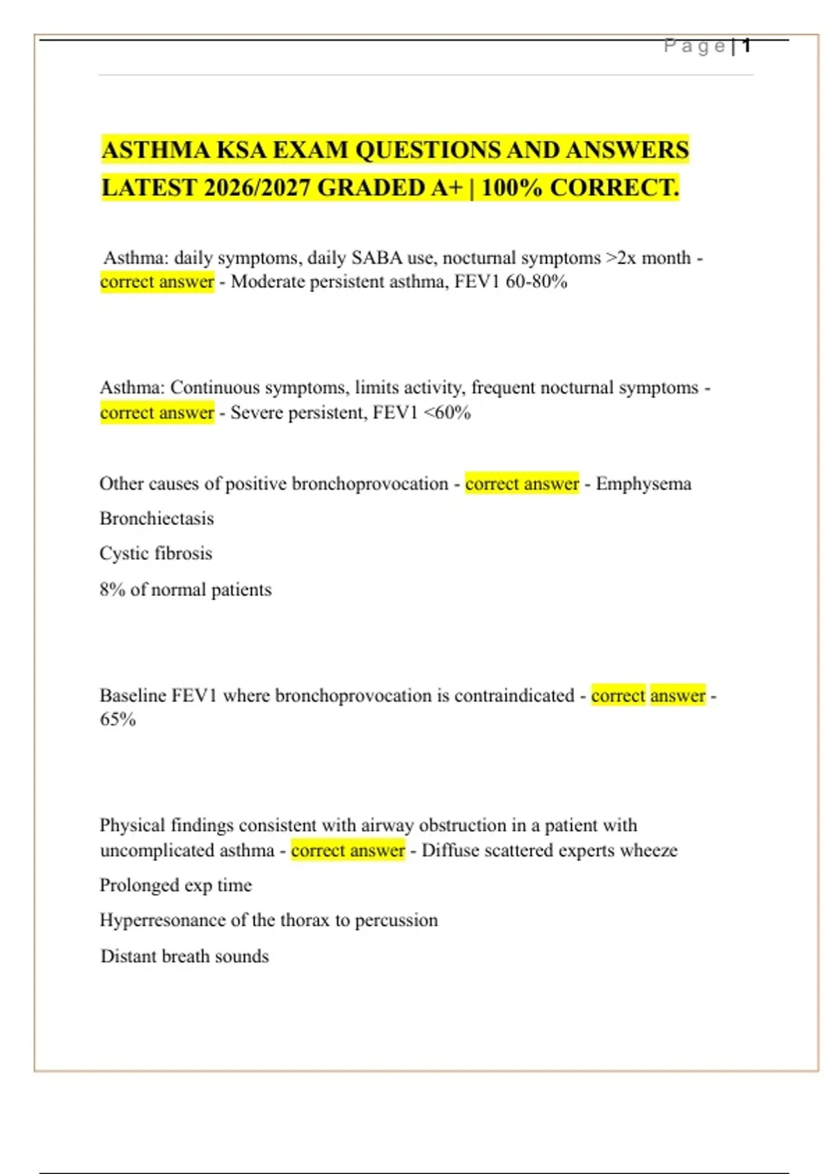 ASTHMA KSA EXAM QUESTIONS AND ANSWERS LATEST 2026/2027 GRADED A+ | 100% CORRECT. Asthma: daily symptoms, daily SABA use, nocturnal symptoms >2x month - correct answer - Moderate persistent asthma, FEV1 60-80% Asthma: Continuous symptoms, limits activity, frequent nocturnal symptoms - correct answer - Severe persistent, FEV1 <60% Other causes of positive bronchoprovocation - correct answer - Emphysema Bronchiectasis Cystic fibrosis 8% of normal patients Baseline FEV1 where bronchoprovocation is contraindicated - correct answer - 65% Physical findings consistent with airway obstruction in a patient with uncomplicated asthma - correct answer - Diffuse scattered experts wheeze Prolonged exp time Hyperresonance of the thorax to percussion Distant breath sounds P a g e | 2 Adjunctive treatments to avoid intubation - correct answer - Intravenous magnesium sulfate therapy Heliox-driven albuterol nebulization Pulsus paradoxus cut off for impending respiratory failure - correct answer - < 30 mmHg pCO2 cutoff for impending respiratory failure - correct answer - >42 mmHg PEF in moderate asthma exacerbation - correct answer - 40-69% Goal SpO2 in asthma exacerbation - correct answer - 90% Syndrome of ASA induced asthma - correct answer - Rhinorrhea, nasal polyps, sinusitis, conjunctival edema, and asthma following aspirin ingestion Treatment of choice of ASA induced asthma - correct answer - Leukotriene modifier
