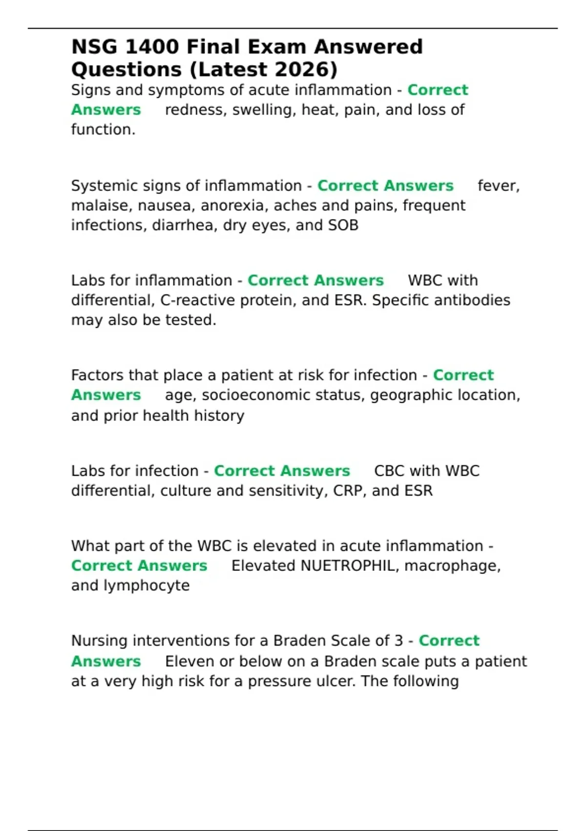 NSG 1400 Final Exam Answered Questions (Latest 2026).
