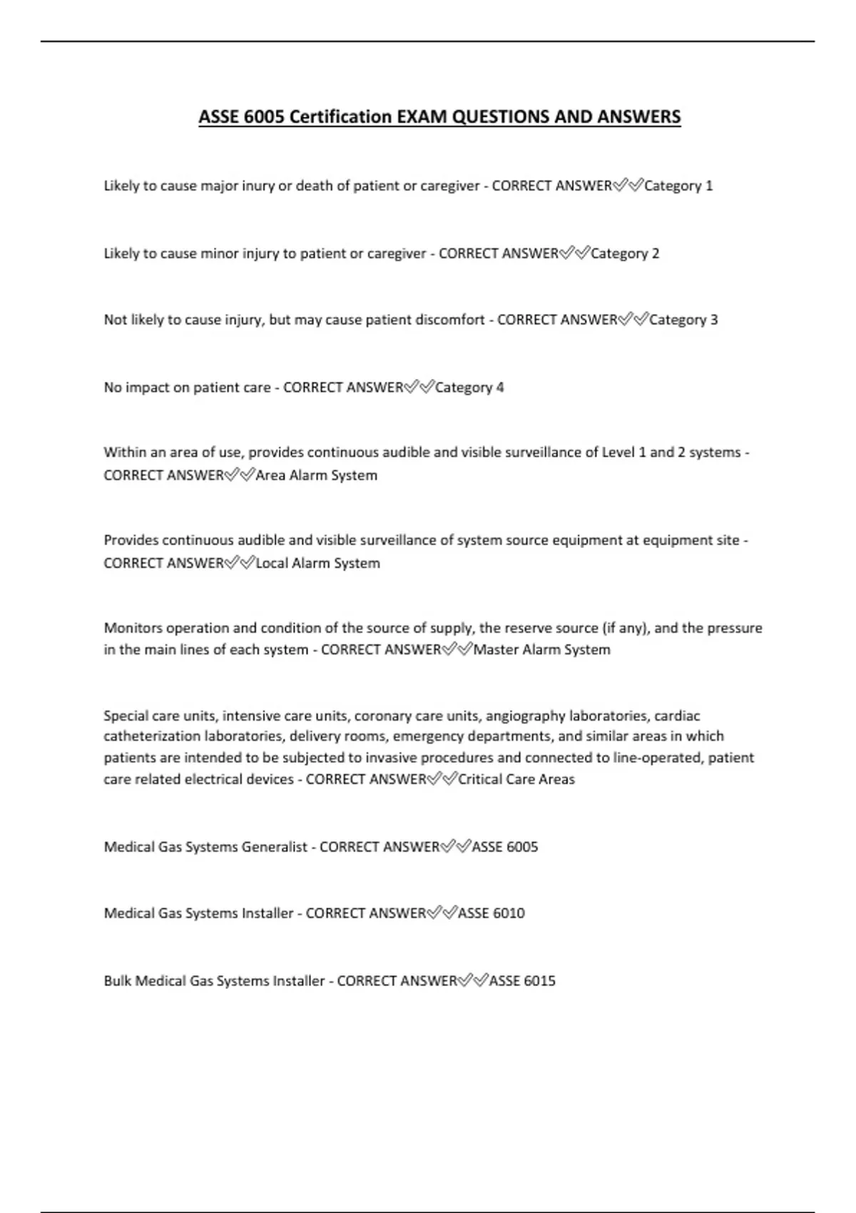 ASSE 6005 Certification EXAM QUESTIONS AND ANSWERS Likely to cause major inury or death of patient or caregiver - CORRECT ANSWERCategory 1