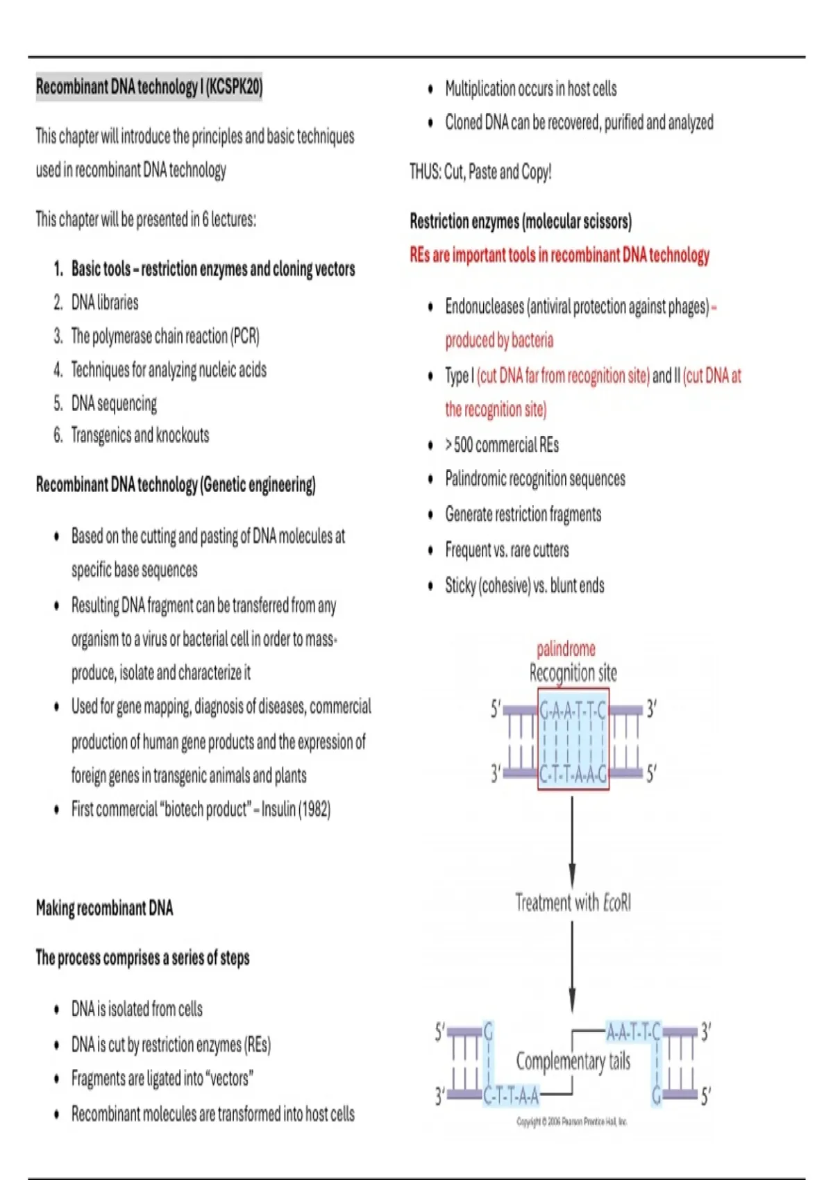 This chapter will be presented in 6 lectures: Restriction enzymes (molecular scissors)