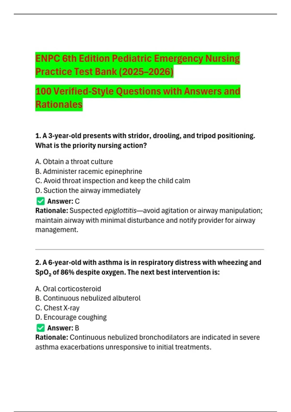 ENPC 6th Edition Pediatric Emergency Nursing Practice Test Bank (2025–2026) 100 Verified-Style Questions with Answers and Rationales