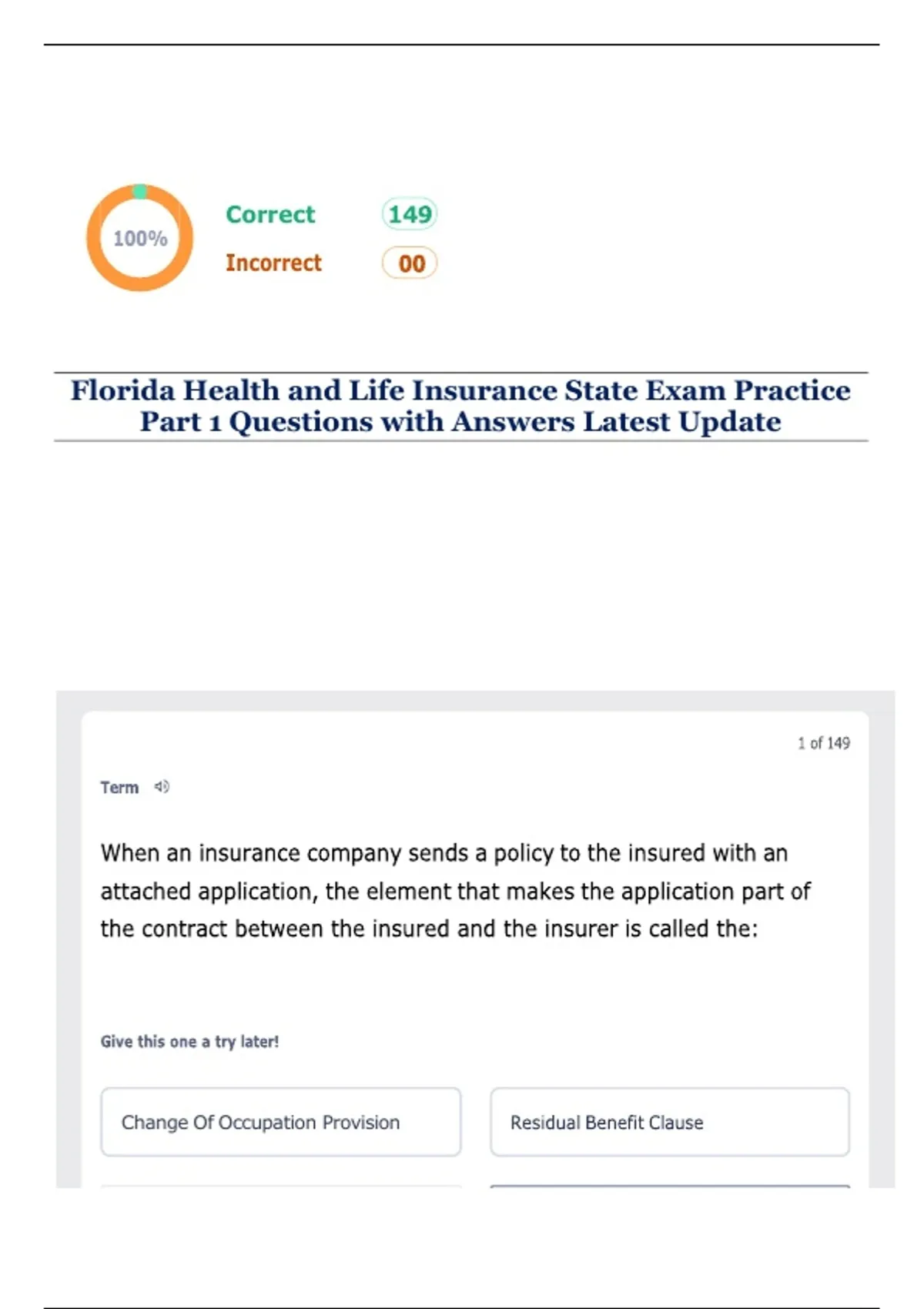 ,Florida Health and Life Insurance State Exam Practice Part 1 Questions with Answers Latest