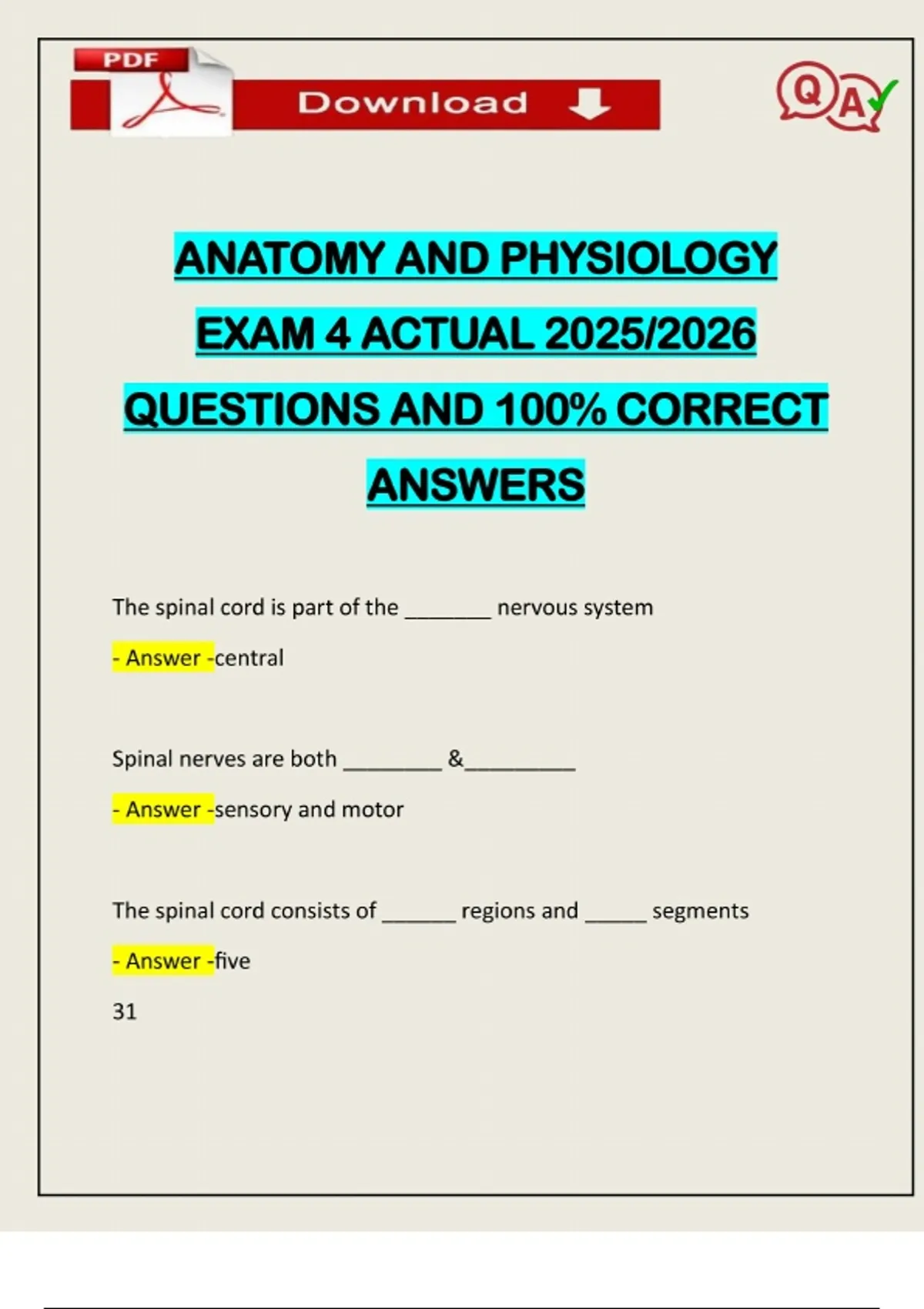 ANATOMY AND PHYSIOLOGY EXAM 4 ACTUAL 2025/2026 QUESTIONS AND 100% CORRECT ANSWERS The spinal cord is part of the _______ nervous system - Answer -central Spinal nerves are both ________ &_________ - Answer -sensory and motor The spinal cord consists of ______ regions and _____ segments - Answer -five 31Need assistance on Online classes, Exams & Assignments? Reach out for instant help!! Full Course Assistance, Plagiarism-free Essay Writing, Research Paper, Dissertation, Discussion Posts, etc…. Confidential & Secure services. Tutors are available for all subjects! Email now at: The ______ terminale is a strand of fibrous tissue that provides longitudinal support as a component of coccygeal ligament - Answer -filum The dorsal root ganglia mainly contains _______ of sensory neurons - Answer -cell bodies