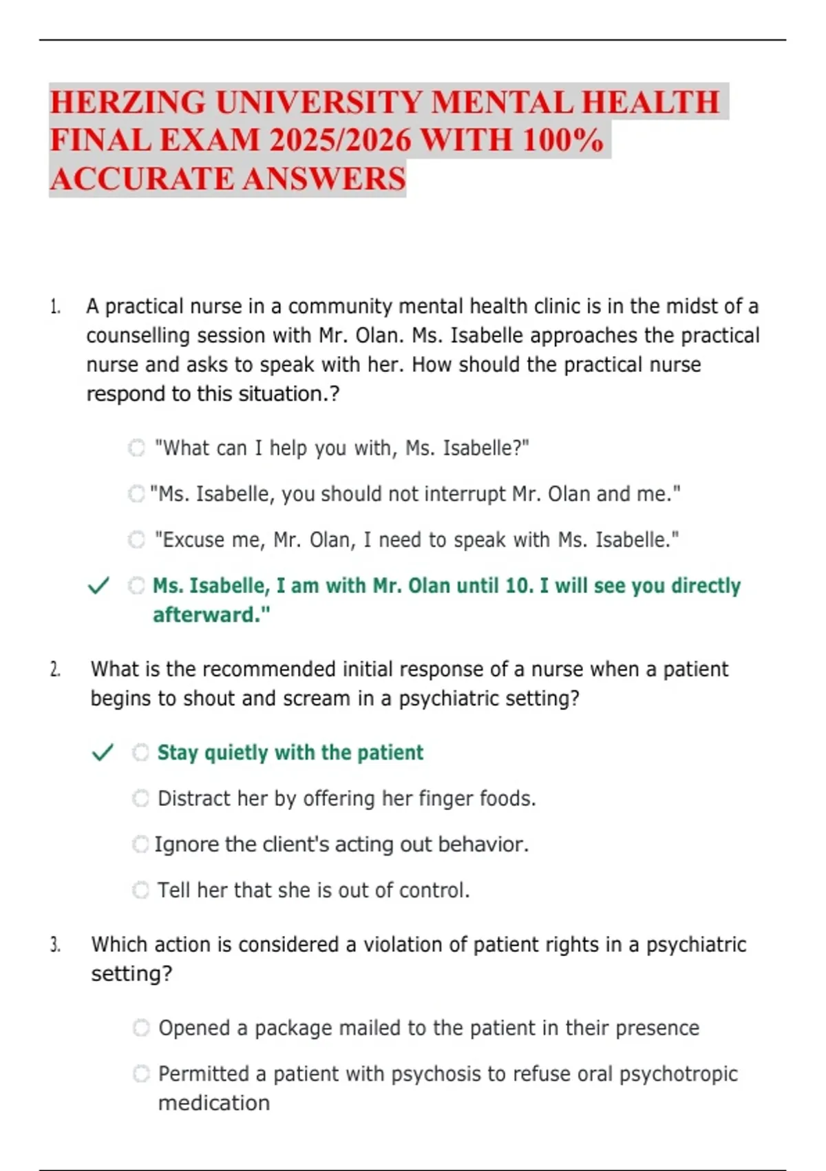 HERZING UNIVERSITY MENTAL HEALTH FINAL EXAM 2025/2026 WITH 100% ACCURATE ANSWERS