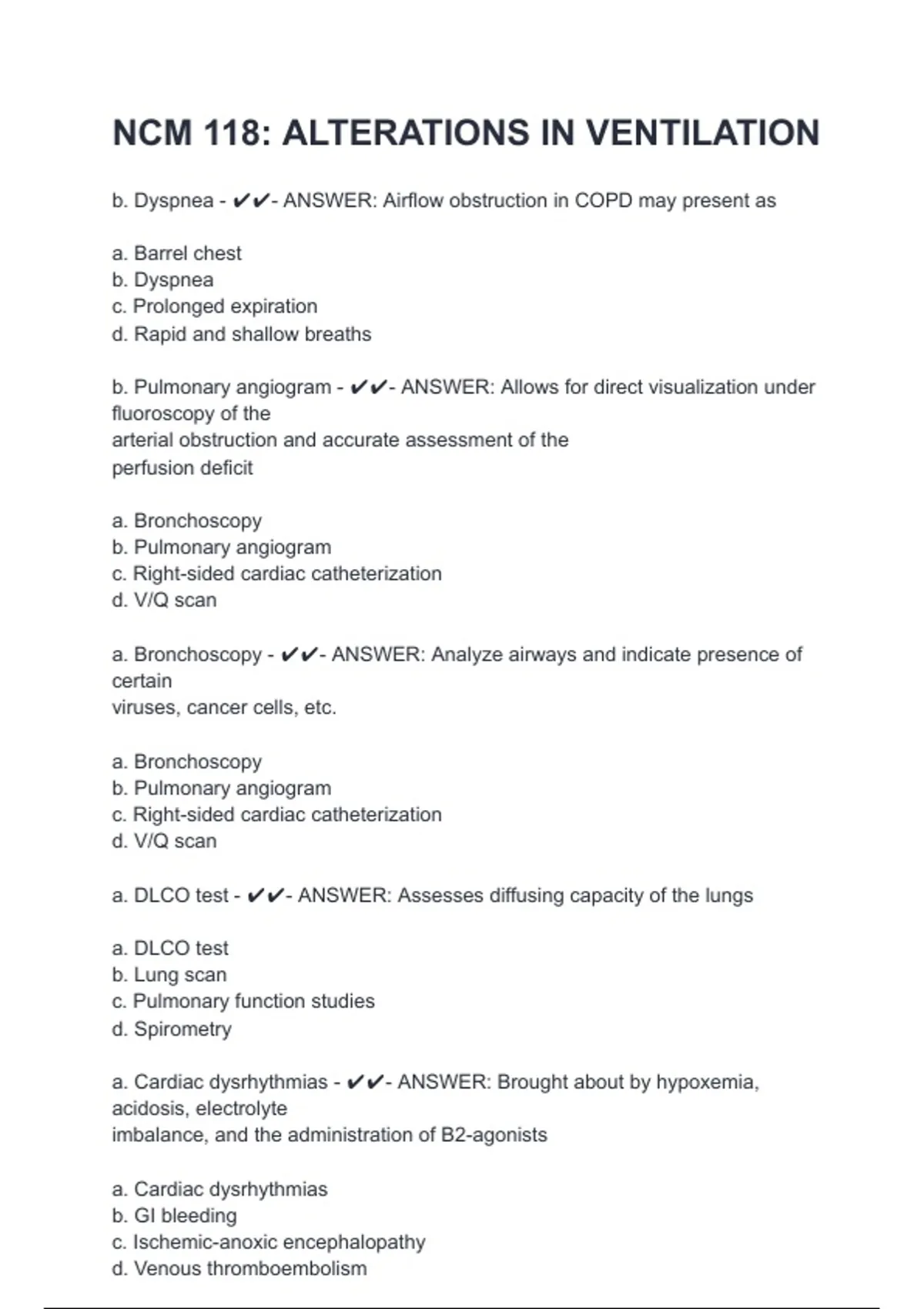 a. DLCO test - ✔✔- ANSWER: Assesses diffusing capacity of the lungs