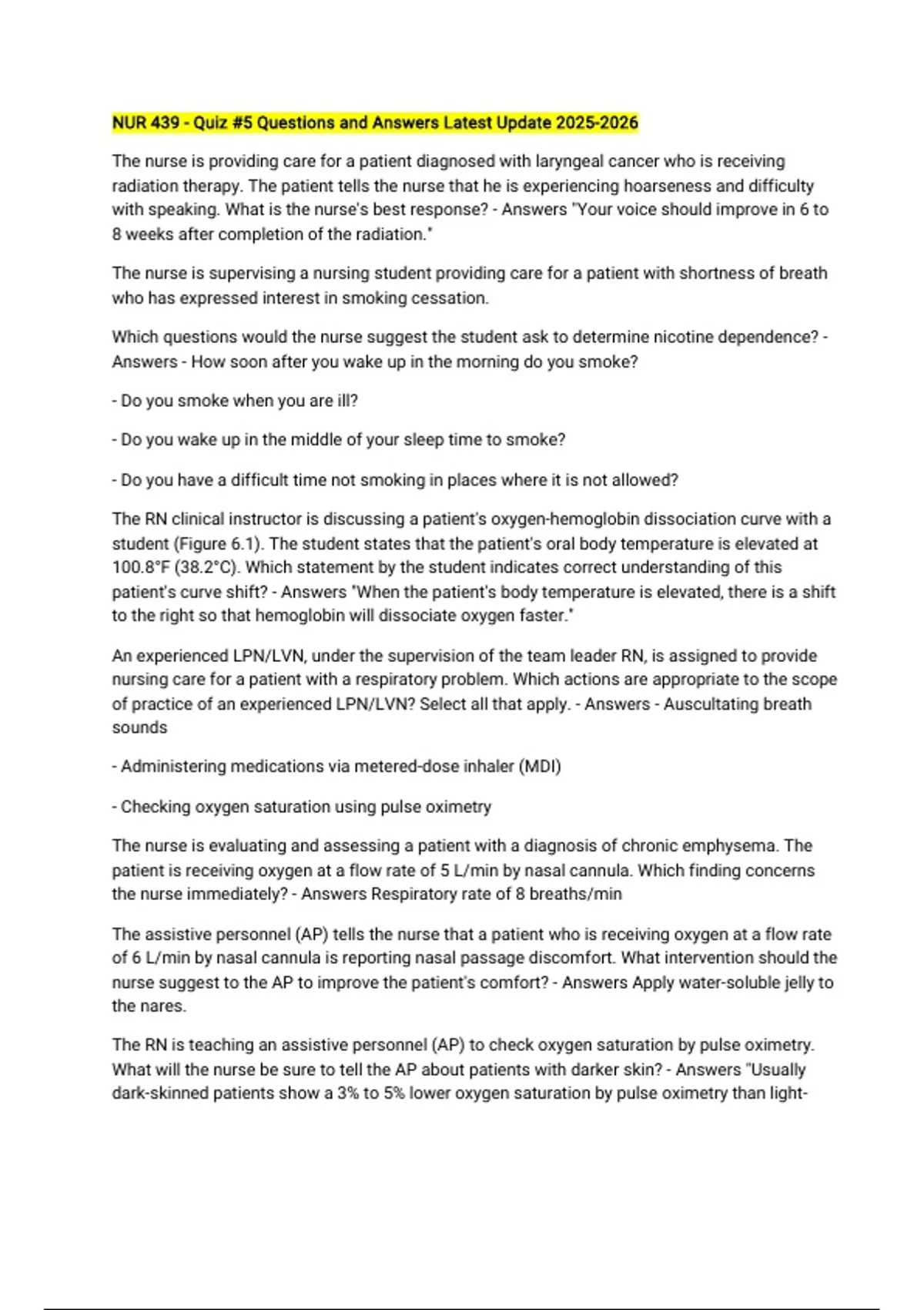 NUR 439 - Quiz #5 Questions and Answers Latest Update The nurse is providing care for a patient diagnosed with laryngeal cancer who is receiving radiation therapy. The patient tells the nurse that he is experiencing hoarseness and difficulty with speaking. What is the nurse's best response? - Answers "Your voice should improve in 6 to 8 weeks after completion of the radiation." The nurse is supervising a nursing student providing care for a patient with shortness of breath who has expressed interest in smoking cessation. Which questions would the nurse suggest the student ask to determine nicotine dependence? - Answers - How soon after you wake up in the morning do you smoke? - Do you smoke when you are ill? - Do you wake up in the middle of your sleep time to smoke? - Do you have a difficult time not smoking in places where it is not allowed? The RN clinical instructor is discussing a patient's oxygen-hemoglobin dissociation curve with a student (Figure 6.1). The student states that the patient's oral body temperature is elevated at 100.8°F (38.2°C). Which statement by the student indicates correct understanding of this patient's curve shift? - Answers "When the patient's body temperature is elevated, there is a shift to the right so that hemoglobin will dissociate oxygen faster." An experienced LPN/LVN, under the supervision of the team leader RN, is assigned to provide nursing care for a patient with a respiratory problem. Which actions are appropriate to the scope of practice of an experienced LPN/LVN? Select all that apply. - Answers - Auscultating breath sounds - Administering medications via metered-dose inhaler (MDI) - Checking oxygen saturation using pulse oximetry The nurse is evaluating and assessing a patient with a diagnosis of chronic emphysema. The patient is receiving oxygen at a flow rate of 5 L/min by nasal cannula. Which finding concerns the nurse immediately? - Answers Respiratory rate of 8 breaths/min The assistive personnel (AP) tells the nurse that a patient who is receiving oxygen at a flow rate of 6 L/min by nasal cannula is reporting nasal passage discomfort. What intervention should the nurse suggest to the AP to improve the patient's comfort? - Answers Apply water-soluble jelly to the nares. The RN is teaching an assistive personnel (AP) to check oxygen saturation by pulse oximetry. What will the nurse be sure to tell the AP about patients with darker skin? - Answers "Usually dark-skinned patients show a 3% to 5% lower oxygen saturation by pulse oximetry than light-