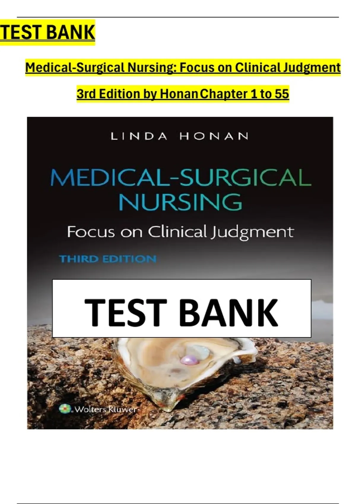 Test Bank For Medical-Surgical Nursing: Focus on Clinical Judgment 3rd Edition. By Linda Honan. All Chapters-1-55 Covered|| 100% Fully Verified Answers|| Latest Edition Test Bank for Medical-Surgical Nursing: Focus on Clinical Judgment, 3rd Edition, leverages years of nursing education expertise and real-world clinical experience to help students master essential information, develop their clinical judgment, and confidently embrace the challenges ahead—from the Next Generation NCLEX® to the day-to-day realities of practice. Medical-Surgical Nursing is expertly curated by active nursing educators and clinicians. Applying a practical, approachable perspective to the breadth of medical-surgical nursing, Linda Honan and her contributors distill essential concepts and practices in precise detail, clarifying processes and complex pathophysiology through need-to-know coverage of the most prominent medical conditions and key nursing responsibilities. Author Dr. Linda Honan’s trademark pedagogical tools, honed throughout her own years as a practitioner and educator, further reinforce the practicing nurse’s perspective and deepen students’ clinical readiness. Every chapter of this 3rd Edition has been revised and updated with an emphasis on clinical judgment and inclusivity, incorporating bias-free, gender-neutral language and walking students through the NCSBN’s Clinical Judgment Measurement Model with new NCLEX questions and case studies. An enhanced focus on determinants of health highlights their impact on health, wellbeing, and quality of life to help students meet Healthy People 2030 objectives, and new content equips students with the latest clinical insights offering complete preparation for the responsibilities students will assume as they embark on their nursing careers in today’s evolving healthcare environment.