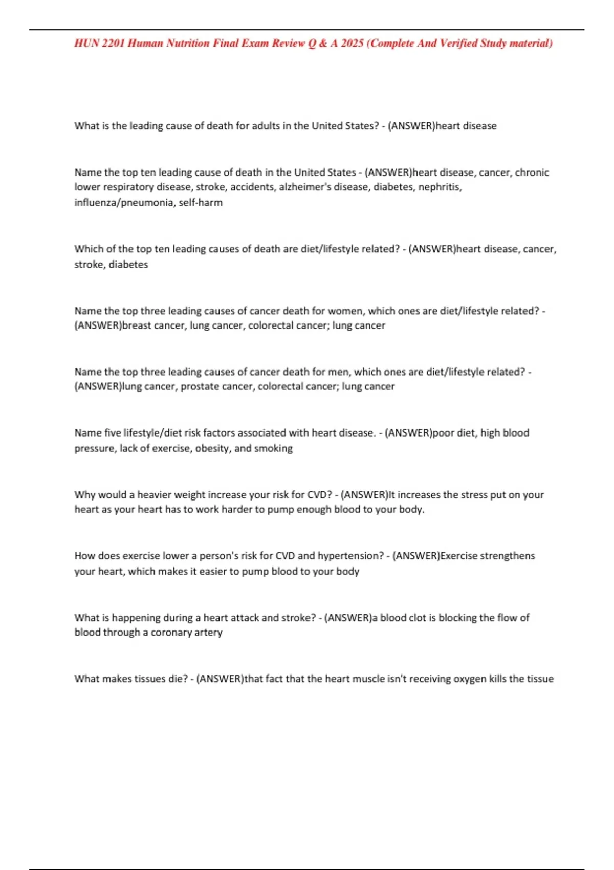 , HUN 2201 Human Nutrition Final Exam Review Q & A 2025 (Complete And Verified Study material)