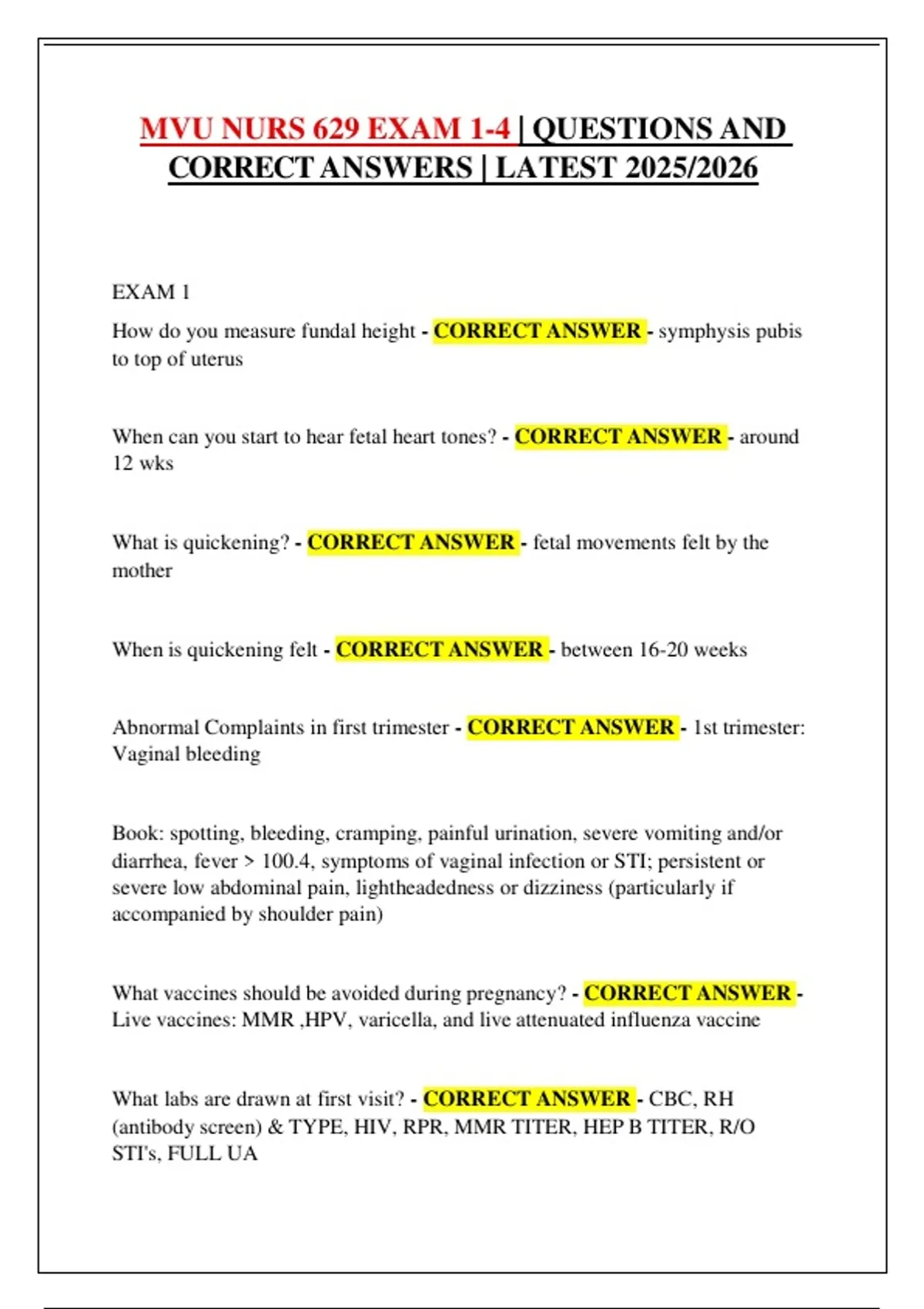 This document compiles the complete set of exams (1 through 4) for the MVU NURS 629 course, covering all latest 2025/2026 nursing questions with verified correct answers. It includes essential topics in maternal–newborn health, pediatrics, and advanced nursing practice, such as pregnancy and postpartum care, pediatric infectious diseases, cardiovascular and respiratory conditions, hematologic disorders, and growth and development. The guide also features lab interpretations, pharmacologic treatments, and key nursing interventions—ideal for students preparing for Maryville University NURS 629 exams or national board reviews.