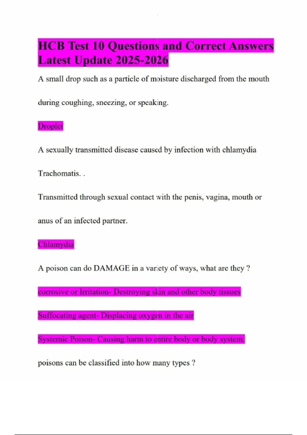 HCB Test 10 Questions and Correct Answers Latest Update A small drop such as a particle of moisture discharged from the mouth during coughing, sneezing, or speaking. Droplet A sexually transmitted disease caused by infection with chlamydia Trachomatis. . Transmitted through sexual contact with the penis, vagina, mouth or anus of an infected partner. Chlamydia A poison can do DAMAGE in a variety of ways, what are they ? corrosive or Irritation- Destroying skin and other body tissues Suffocating agent- Displacing oxygen in the air Systemic Poison- Causing harm to entire body or body system. poisons can be classified into how many types ? 4 venoms produced by arthropods are mixtures of four toxic types, what are they ? vesicating ( blister beetles) Nuerotoxic ( black widow spiders) Cytolytic ( Brown Recluse Spiders) Hemolytic ( Horse Flies) _, _, and _ may serve as reservoirs for plague, endemic typhus, tularemia, and other debilitating disease rats, mice and ground squirrels what rodent is the most common on ships? Norway rat _ are probably the most common and persistently troublesome arthropod pest encountered indoors. they often cause anxiety and repulsion and may lead to entomophobia( fear of insects) which is of special consideration in regard to hospital patients comfort and recovery They often defile, contaminate, or damage food, linens, books, utensils, and other supplies and equipment