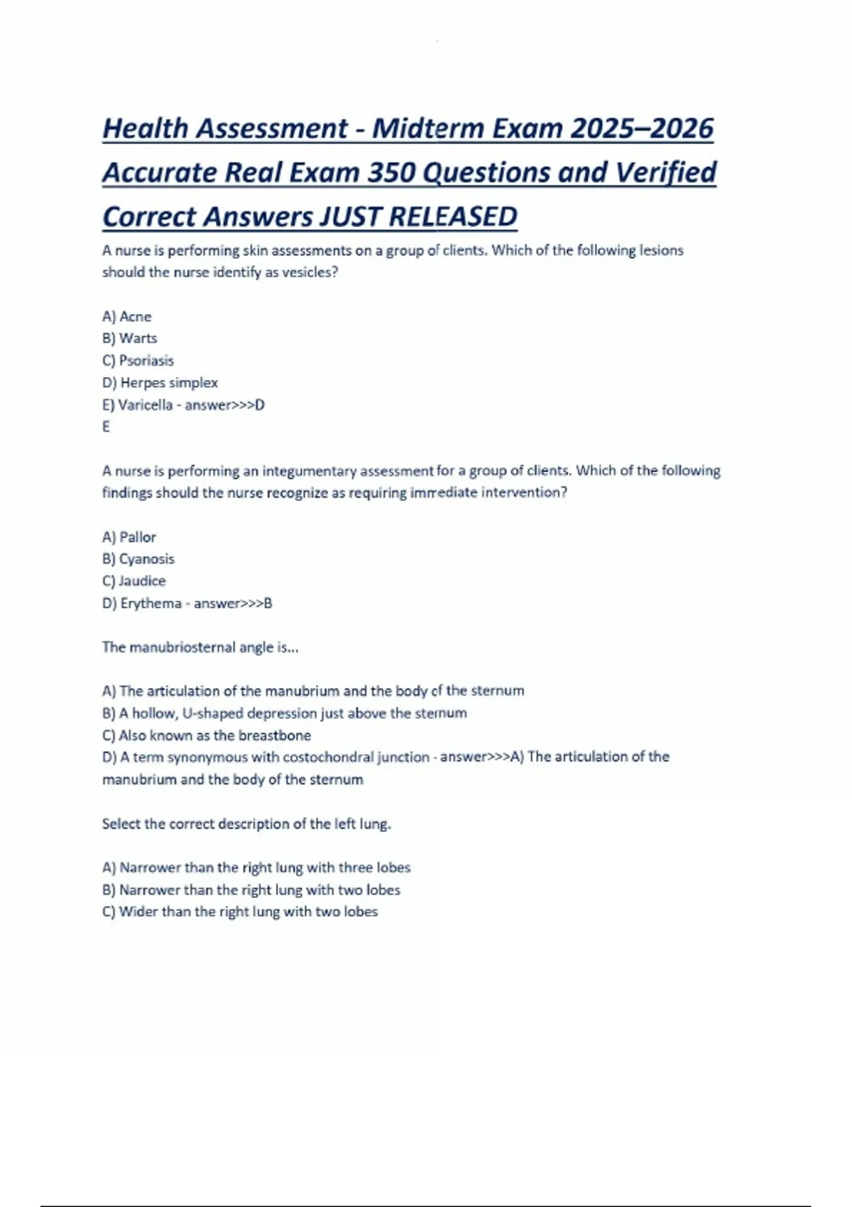 Health Assessment - Midterm Exam-350 Questions with Verified Solutions.Health Assessment - Midterm Exam-350 Questions with Verified Solutions.