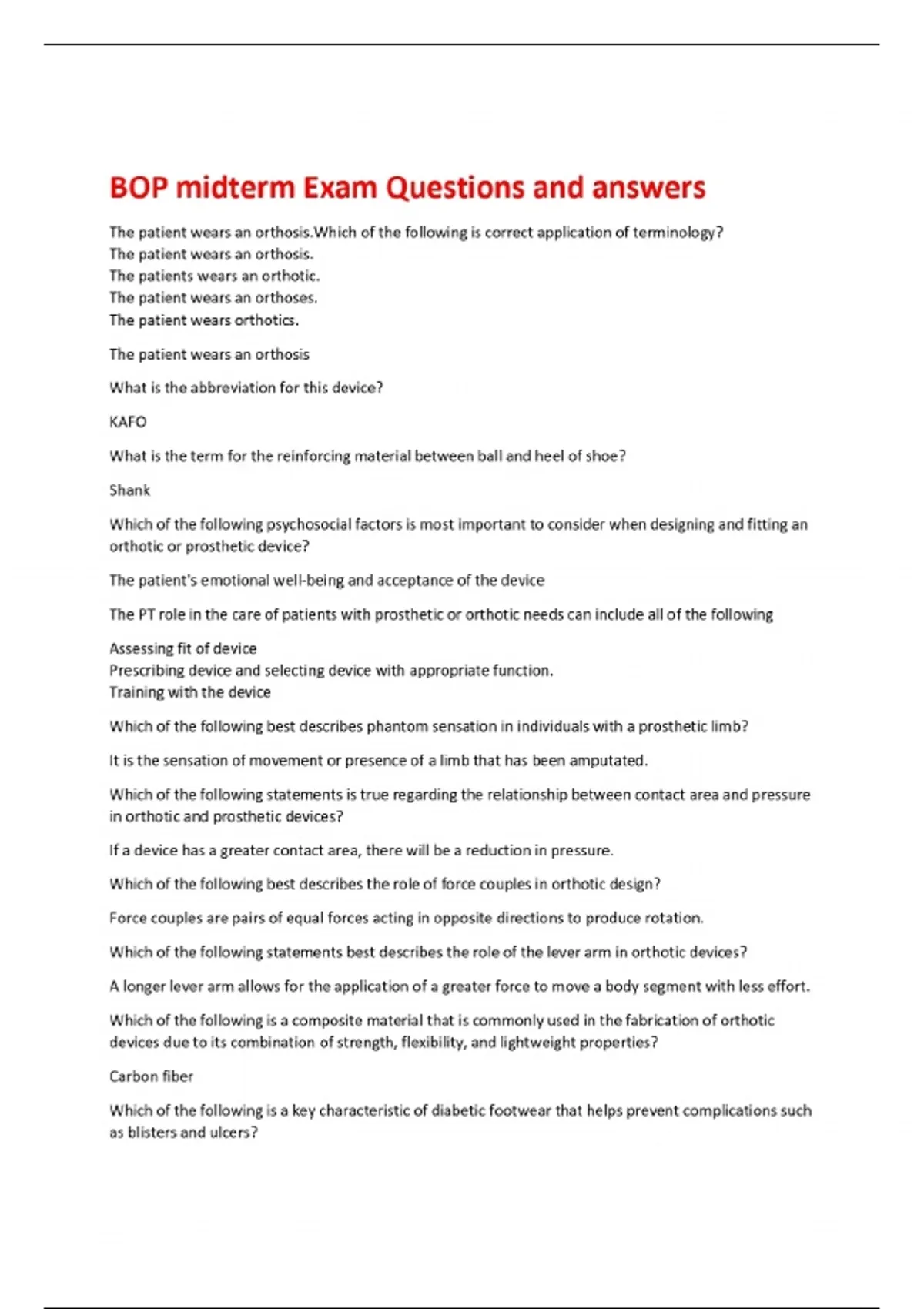 BOP midterm Exam Questions and answers The patient wears an orthosis.Which of the following is correct application of terminology? The patient wears an orthosis. The patients wears an orthotic. The patient wears an orthoses. The patient wears orthotics. The patient wears an orthosis What is the abbreviation for this device? KAFO What is the term for the reinforcing material between ball and heel of shoe? Shank
