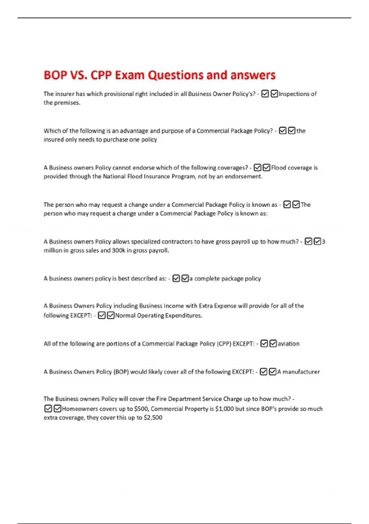 BOP VS. CPP Exam Questions and answers The insurer has which provisional right included in all Business Owner Policy's? - Inspections of the premises. Which of the following is an advantage and purpose of a Commercial Package Policy? - the insured only needs to purchase one policy A Business owners Policy cannot endorse which of the following coverages? - Flood coverage is provided through the National Flood Insurance Program, not by an endorsement.