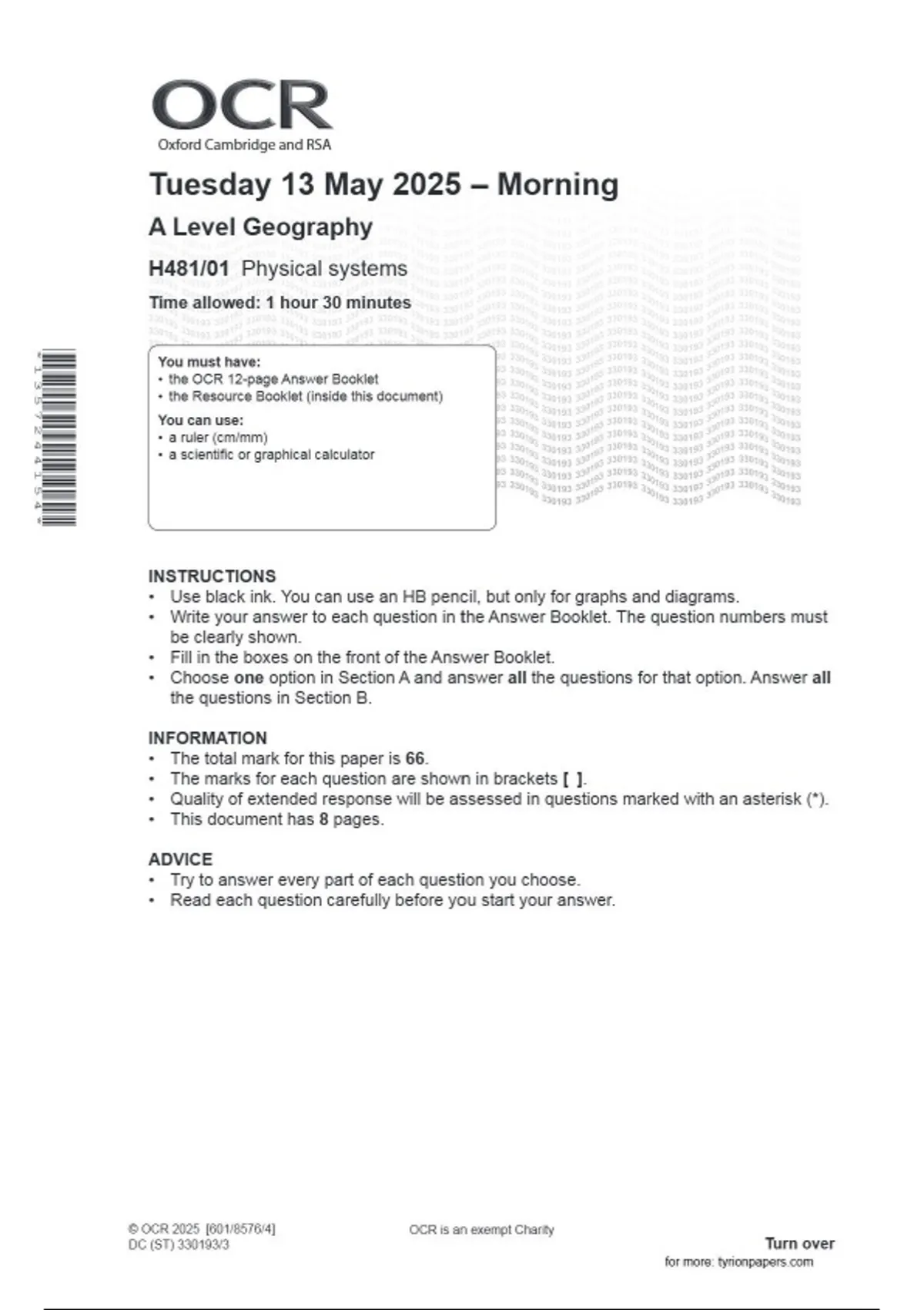 OCR A LEVEL Geography H481/01 JUNE 2025 QUESTION PAPER: Physical systems