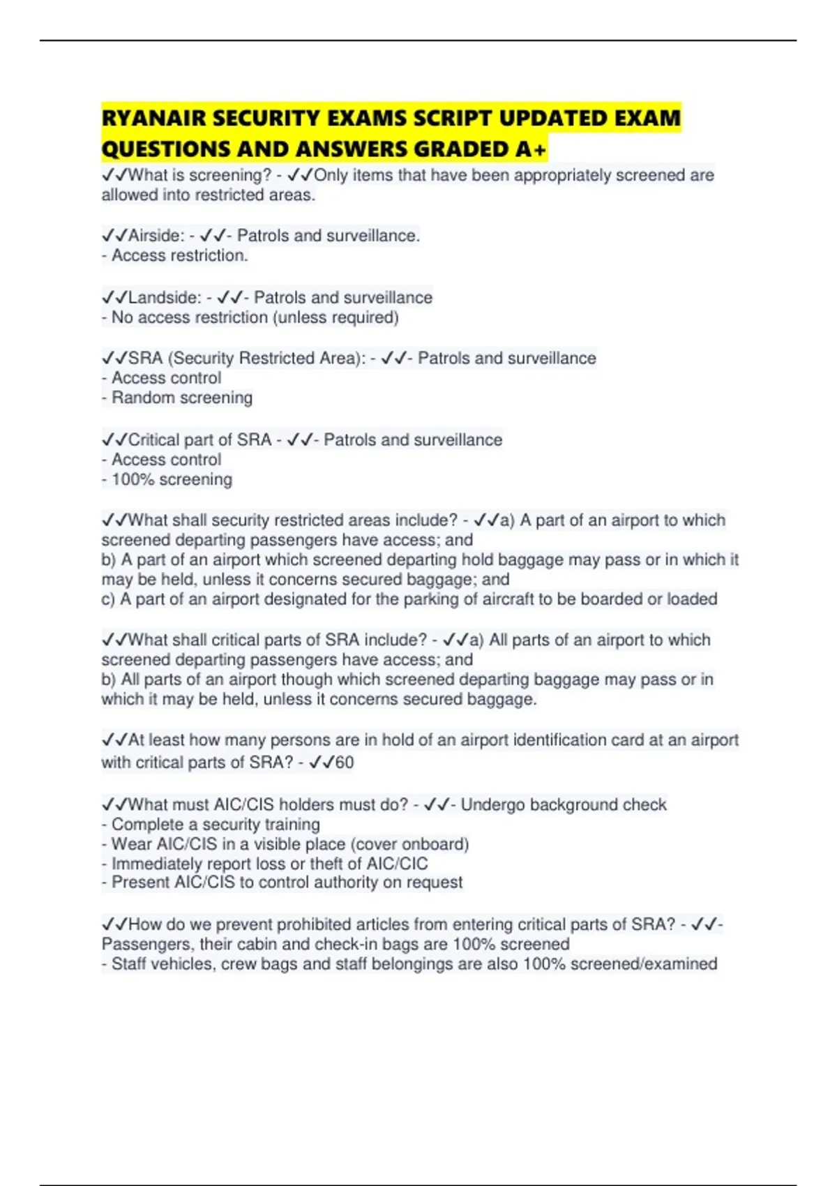 RYANAIR SECURITY EXAMS SCRIPT UPDATED EXAM QUESTIONS AND ANSWERS GRADED A+