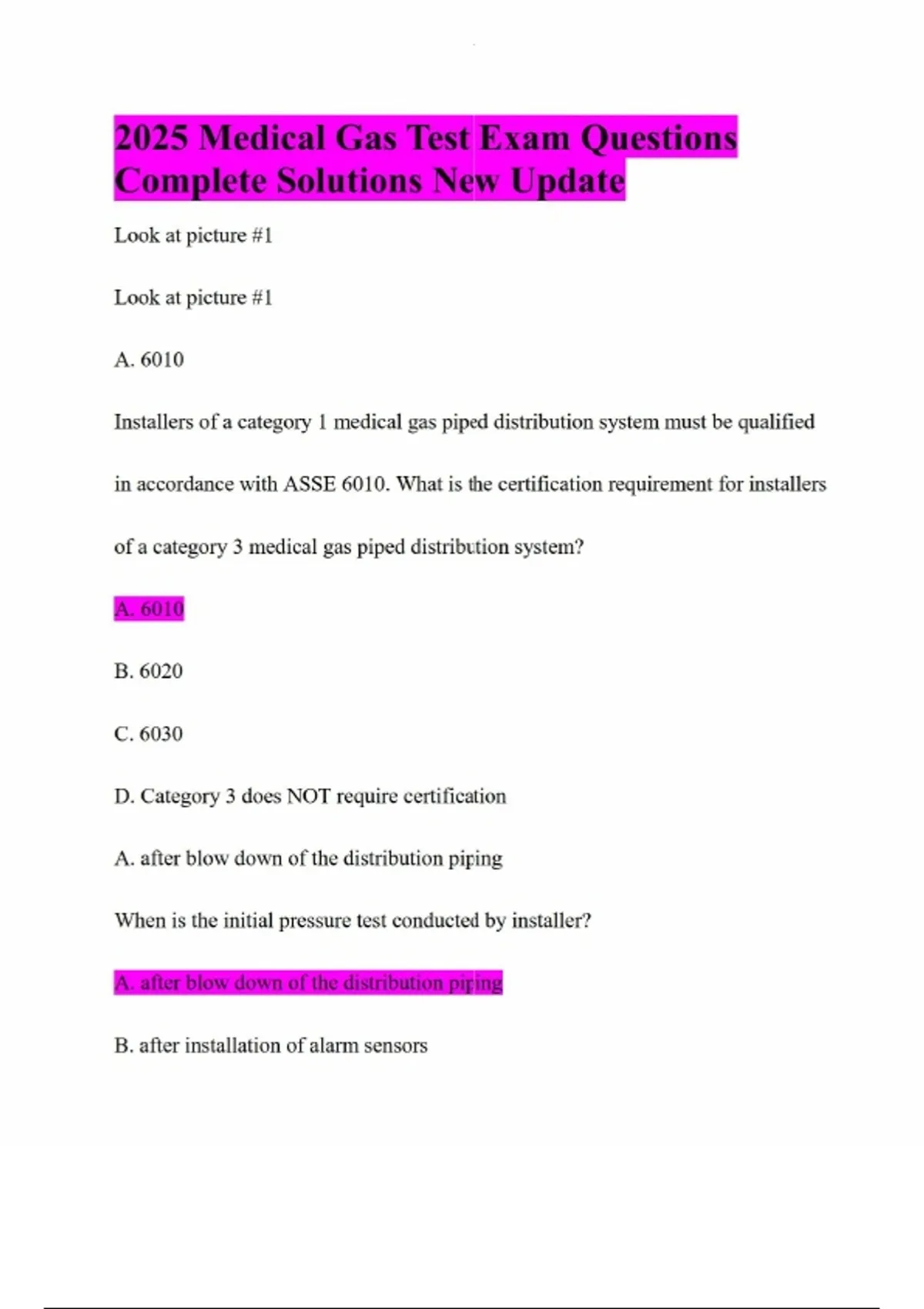 2025 Medical Gas Test Exam Questions Complete Solutions New Update Look at picture #1 Look at picture #1 A. 6010 Installers of a category 1 medical gas piped distribution system must be qualified in accordance with ASSE 6010. What is the certification requirement for installers of a category 3 medical gas piped distribution system? A. 6010 B. 6020 C. 6030 D. Category 3 does NOT require certification A. after blow down of the distribution piping When is the initial pressure test conducted by installer? A. after blow down of the distribution piping B. after installation of alarm sensors C. before blow down of the distribution piping D. before installation of station rough-in assemblies C. polymeric In those portions of systems intended to handle oxygen at pressures greater than 350 psi, the interconnecting hose shall NOT contain __________ materials. A. brass B. copper C. polymeric D. stainless steel A. color coding Which of these is an NFPA 99 requirement for the labeling of pipes in a medical gas system? A. color coding B. fixed label width C. label shall wrap completely around the pipe D. reflective label D. The device will be supervised such that failure of communication shall initiate an alarm A wireless communication device is employed in a medical gas or vacuum warning system. Which type of supervision is required for this device? A. A visual indicator shall be located in the maintenance office or the engineering department. B. The device shall be installed at the medical gas or vacuum source. C. The device shall be located at a nurse's station D. The device will be supervised such that failure of communication shall initiate an alarm. D. zone valve box Refer to DIAGRAM 1. Identify #7 A. in-line valve B. main control valve C. service valve D. zone valve box B. future Refer to DIAGRAM I. Identify #8 A. dead end B. future valve C. history valve D. in-line valve B. cut ends may be rolled smooth or deburred What sort of treatment shall be permitted before brazing the cut ends of a tube to be installed in medical gas piping systems?