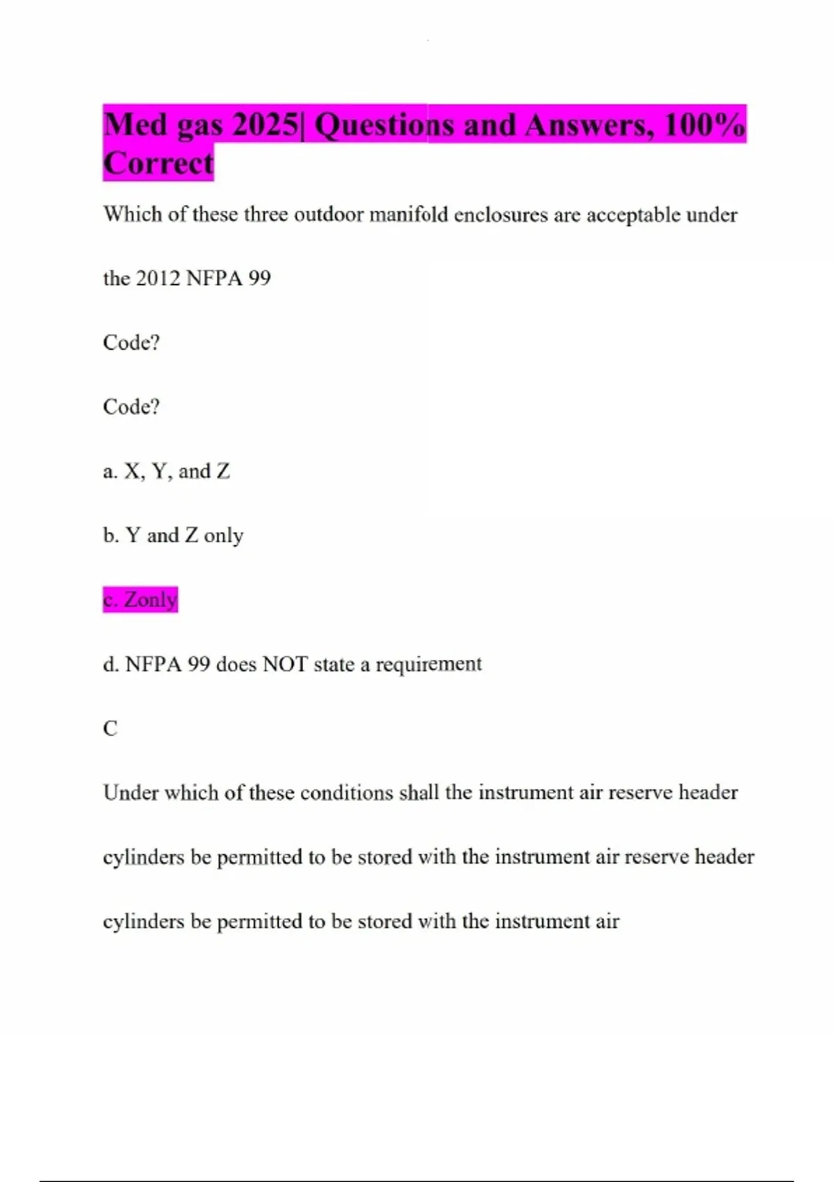 Med gas 2025| Questions and Answers, 100% Correct Which of these three outdoor manifold enclosures are acceptable under the 2012 NFPA 99 Code? Code? a. X, Y, and Z b. Y and Z only c. Zonly d. NFPA 99 does NOT state a requirement C Under which of these conditions shall the instrument air reserve header cylinders be permitted to be stored with the instrument air reserve header cylinders be permitted to be stored with the instrument air a. The mechanical equipment room does NOT contain a boiler. b. The medical air compressors are in the same room. c. The only motor-driven machinery in the room is for the instrument air equipment. d. The room is secured with lockable doors. B Riser valves are those valves located where? a. Adjacent to the main riser downstream of any zone valve b. Anywhere in the lateral branches of the piping system c. In the main line adjacent to the base of the riser d. In the riser adjacent to the main line D Installers of a Category 1 medical gas piped distribution system must be qualified in accordance with ASS: 6010. What is the certification requirement for installers of a Category 3 medical gas piped distribution system? a. 6010 b. 6020 C.6030 d. Category 3 does NOT require certification. A When is the initial pressure test conducted by the Installer? a. After blow down of the distribution piping b. After installation of alarm sensors c. Before blow down of the distribution piping d. Before installation of station rough-in assemblies A those portions of systems intended to handle oxygen at pressures greater than 350 psi, the interconnecting hose shall NOT containmaterials. a. Brass b. Copper c. Polymeric d. Stainless steel Polymeric The tool shown here allows the installer to mechanically limit the makeup depth of the fitting to be brazed. Under what conditions is this method permitted for the installation of medical gas piping? Where the limited make up depth is not less than minimum cup depth per ANSI/ASME recommendations