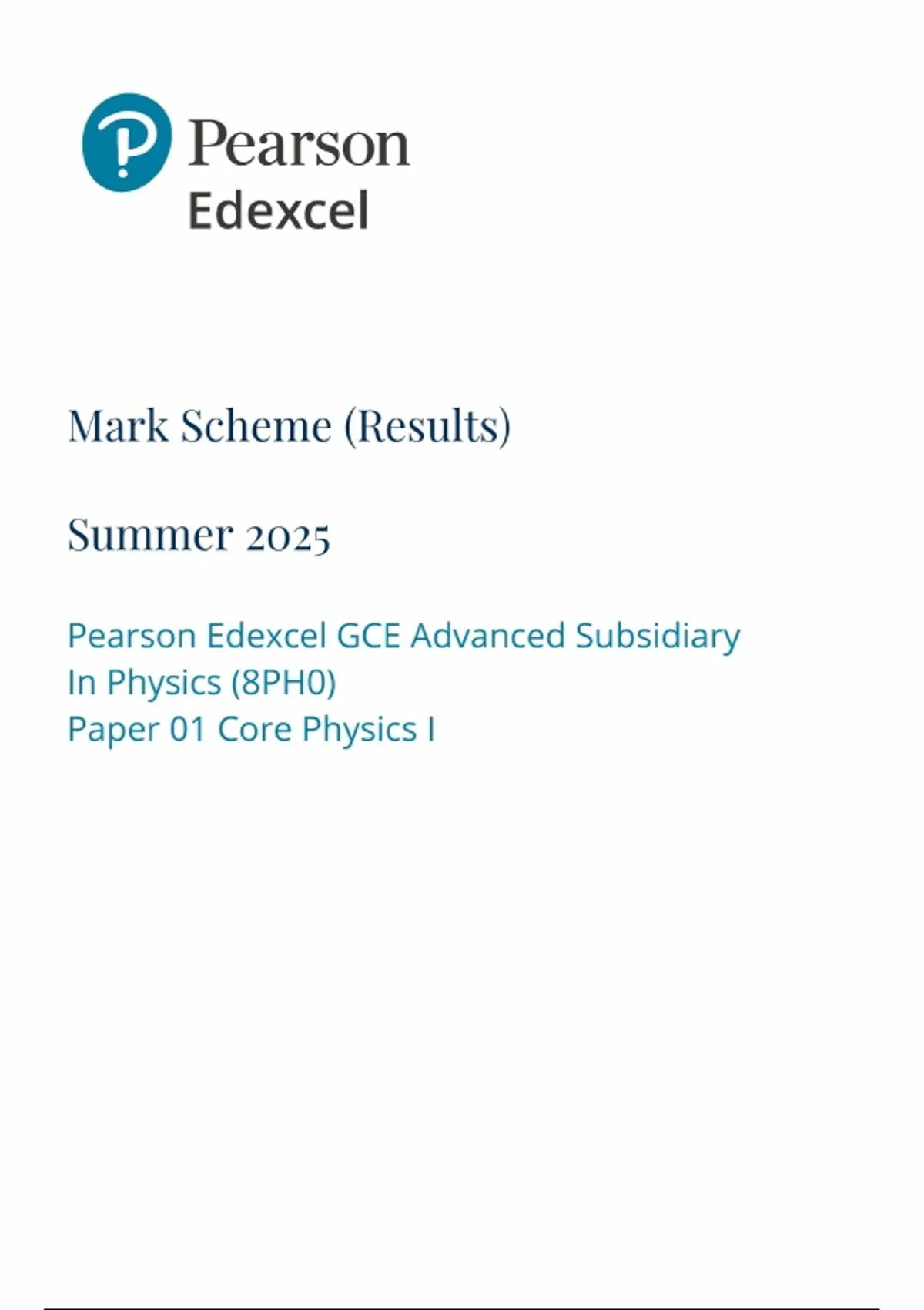 Pearson Edexcel A LEVEL Physics mark scheme PAPER 1 2025 (8PH0/O1: Core Physics I )