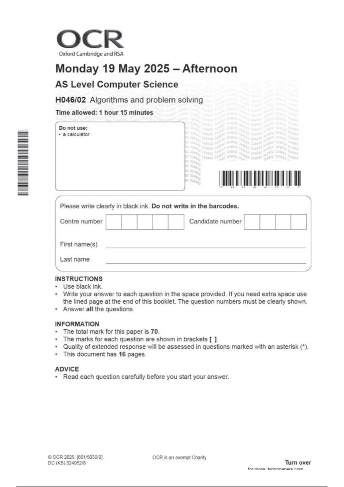 OCR AS Level Computer Science H046/02 Algorithms and problem solving June 2025