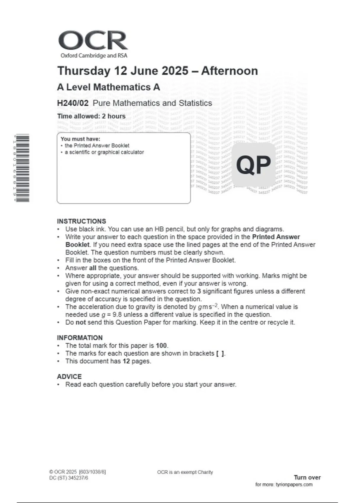 OCR A LEVEL Mathematics A H240/02 JUNE 2025 QUESTION PAPER: Pure Mathematics and Statistics