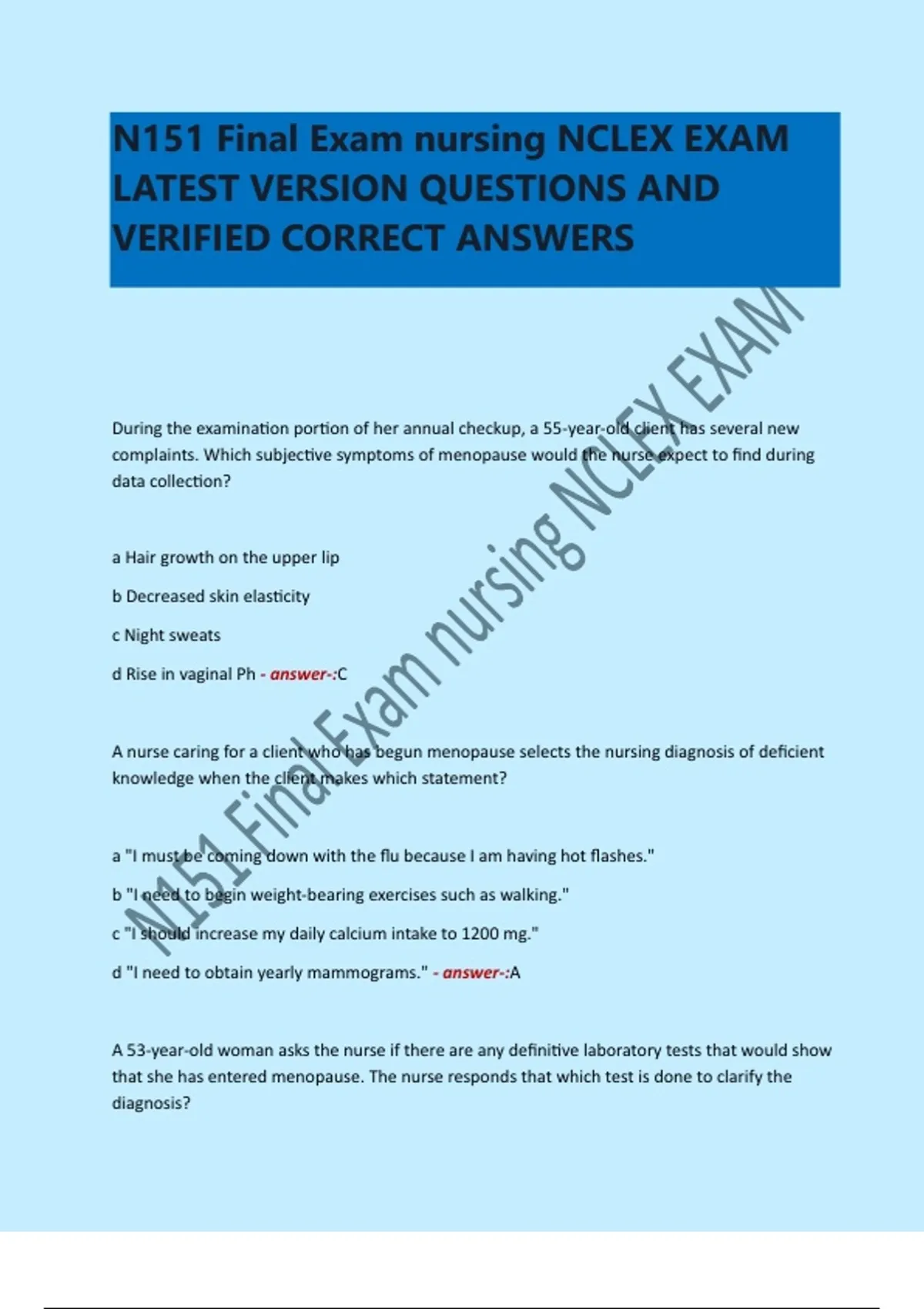 During the examination portion of her annual checkup, a 55-year-old client has several new