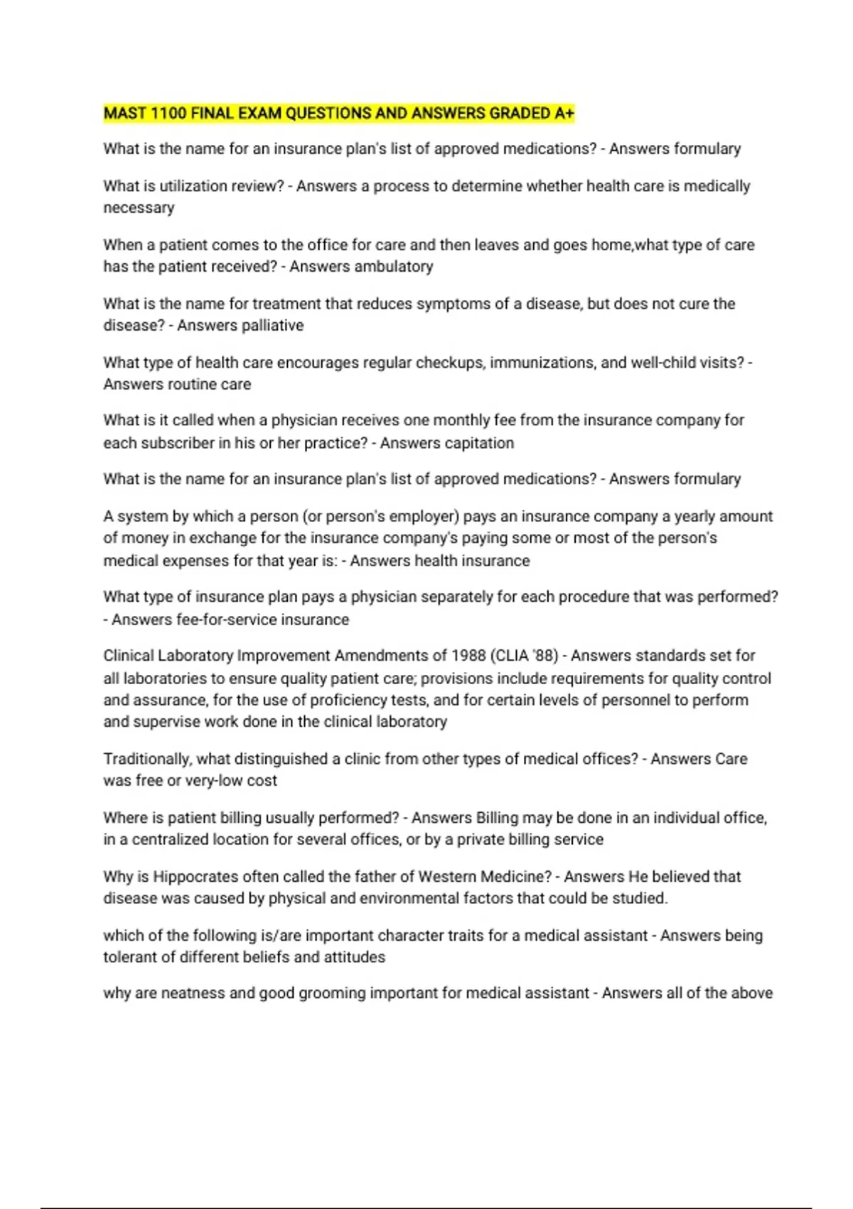 MAST 1100 FINAL EXAM QUESTIONS AND ANSWERS GRADED A+ What is the name for an insurance plan's list of approved medications? - Answers formulary What is utilization review? - Answers a process to determine whether health care is medically necessary When a patient comes to the office for care and then leaves and goes home,what type of care has the patient received? - Answers ambulatory What is the name for treatment that reduces symptoms of a disease, but does not cure the disease? - Answers palliative What type of health care encourages regular checkups, immunizations, and well-child visits? - Answers routine care What is it called when a physician receives one monthly fee from the insurance company for each subscriber in his or her practice? - Answers capitation What is the name for an insurance plan's list of approved medications? - Answers formulary A system by which a person (or person's employer) pays an insurance company a yearly amount of money in exchange for the insurance company's paying some or most of the person's medical expenses for that year is: - Answers health insurance What type of insurance plan pays a physician separately for each procedure that was performed? - Answers fee-for-service insurance Clinical Laboratory Improvement Amendments of 1988 (CLIA '88) - Answers standards set for all laboratories to ensure quality patient care; provisions include requirements for quality control and assurance, for the use of proficiency tests, and for certain levels of personnel to perform and supervise work done in the clinical laboratory Traditionally, what distinguished a clinic from other types of medical offices? - Answers Care was free or very-low cost Where is patient billing usually performed? - Answers Billing may be done in an individual office, in a centralized location for several offices, or by a private billing service Why is Hippocrates often called the father of Western Medicine? - Answers He believed that disease was caused by physical and environmental factors that could be studied. which of the following is/are important character traits for a medical assistant - Answers being tolerant of different beliefs and attitudes why are neatness and good grooming important for medical assistant - Answers all of the above what is the name given to the practical experience in a physician office that is included in a medical assisting program - Answers externship what is the most direct route for career advancement for a medical assistant - Answers office or practice management what is meant by the term defensive medicine? - Answers physicians order more diagnostic tests than before as a defense against a possible lawsuit what is a key concept of the hippocratic oath - Answers do no harm confidentiality and avoiding harm to pts