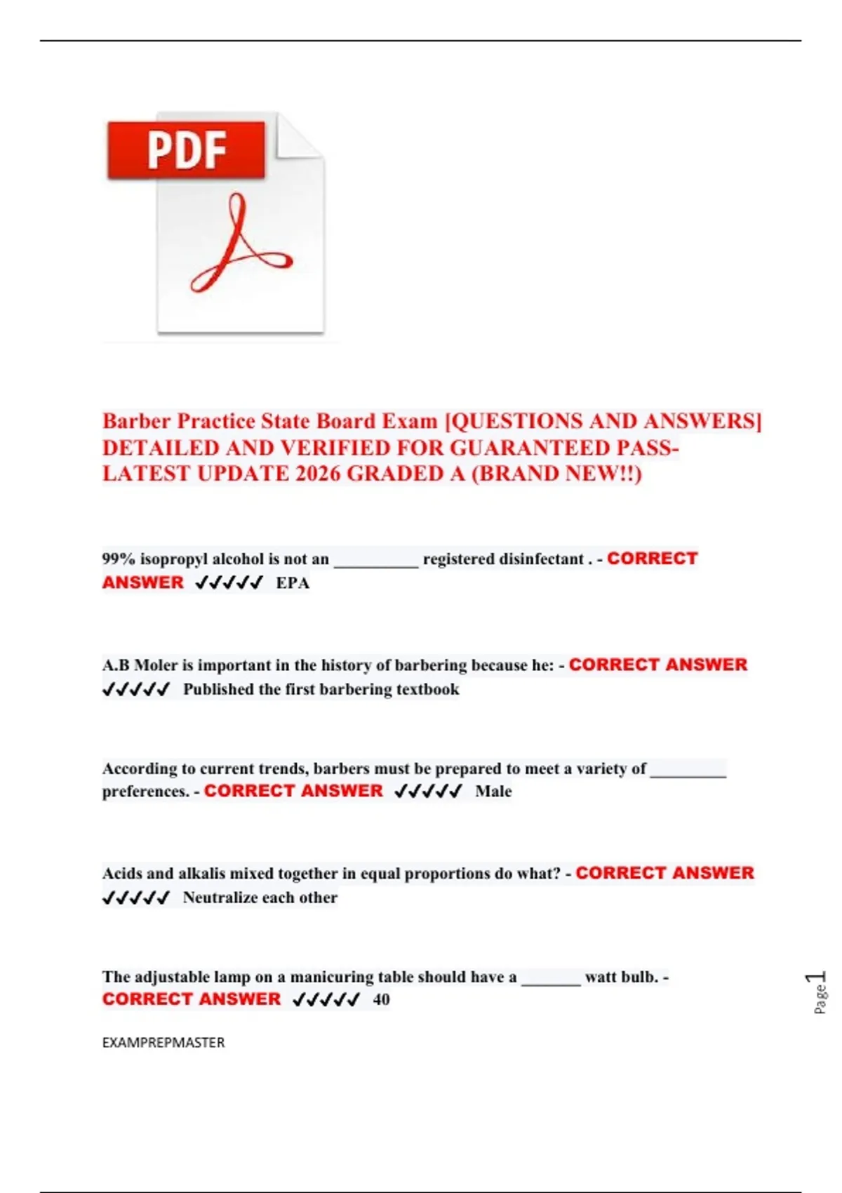 This Barber Practice State Board Exam guide provides verified questions and detailed answers to help students prepare for licensing success. Covers essential barbering topics, including haircutting, shaving, sanitation, and state regulations. Perfect for exam review, reinforcing knowledge, and achieving top scores.
