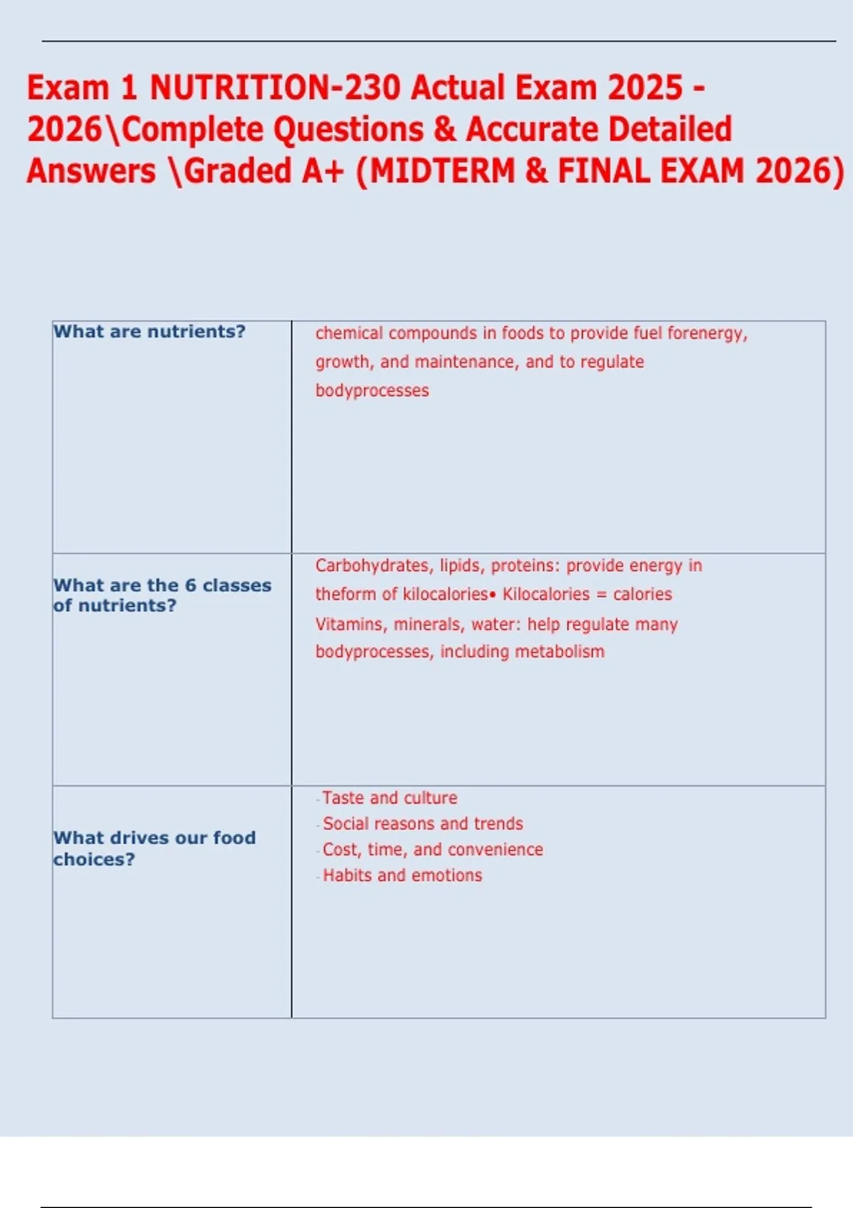Exam 1 NUTRITION-230 Actual Exam Complete Questions & Accurate Detailed Answers Graded A+ (MIDTERM & FINAL EXAM 2026) Exam 1 NUTRITION-230 Actual Exam Complete Questions & Accurate Detailed Answers Gra