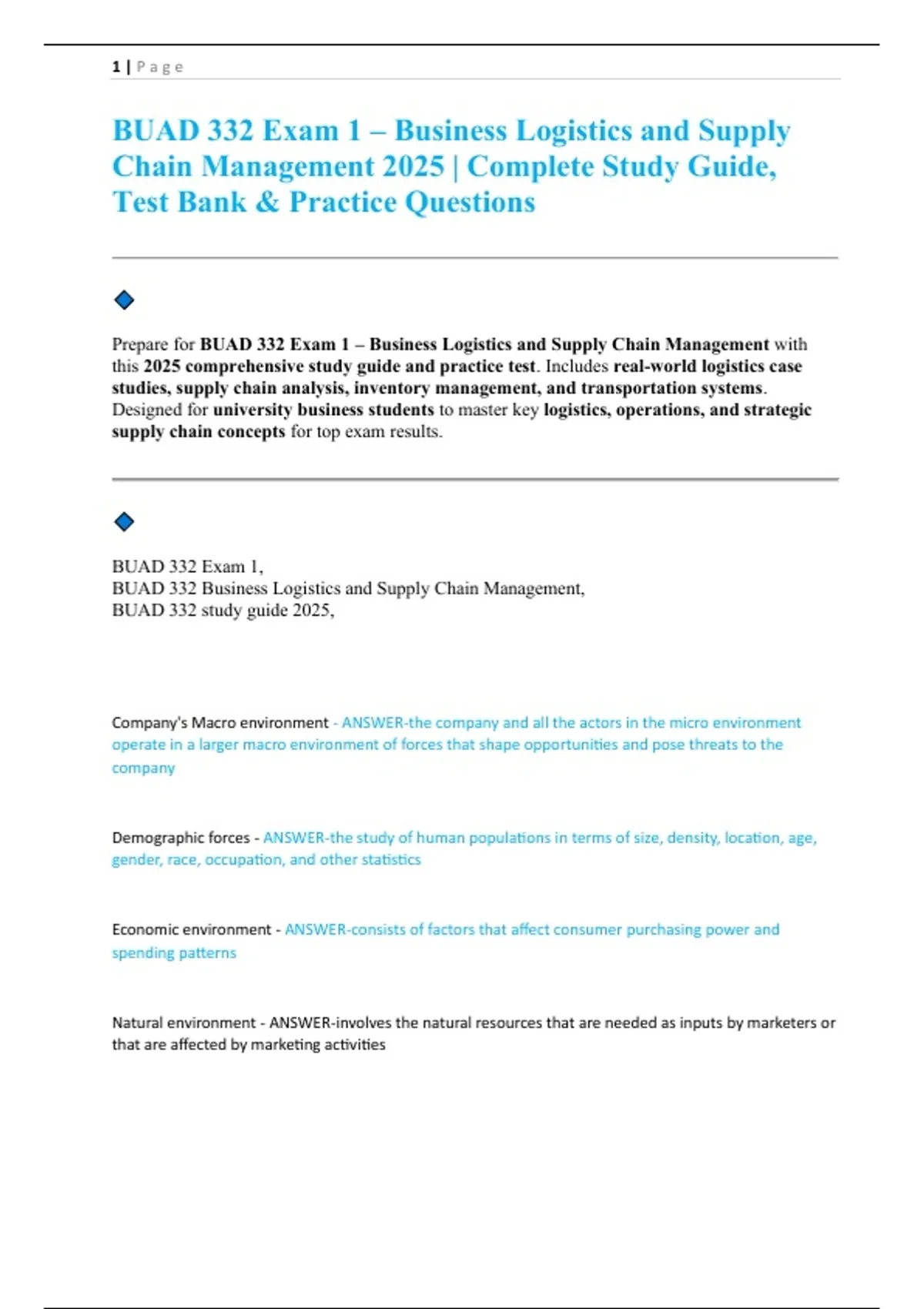 BUAD 332 Exam 1 – Business Logistics and Supply Chain Management 2025 Complete Study Guide, Test Bank & Practice Questions