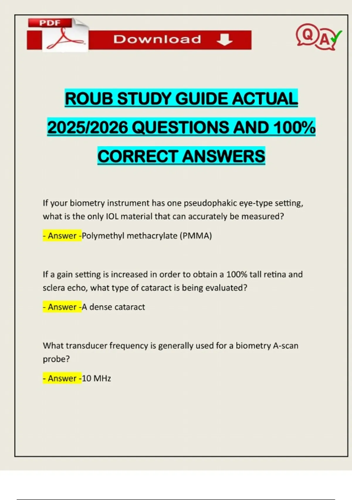 ROUB STUDY GUIDE ACTUAL 2025/2026 QUESTIONS AND 100% CORRECT ANSWERS If your biometry instrument has one pseudophakic eye-type setting, what is the only IOL material that can accurately be measured? - Answer -Polymethyl methacrylate (PMMA) If a gain setting is increased in order to obtain a 100% tall retina and sclera echo, what type of cataract is being evaluated? - Answer -A dense cataract What transducer frequency is generally used for a biometry A-scan probe? - Answer -10 MHzNeed assistance on Online classes, Exams & Assignments? Reach out for instant help!! Full Course Assistance, Plagiarism-free Essay Writing, Research Paper, Dissertation, Discussion Posts, etc…. Confidential & Secure services. Tutors are available for all subjects! Email now at: What is the velocity of a biometer that only uses an average velocity to measure the entire axial length? - Answer -1550 m/sec What is one of the most important features of a biometer? - Answer -Display screen