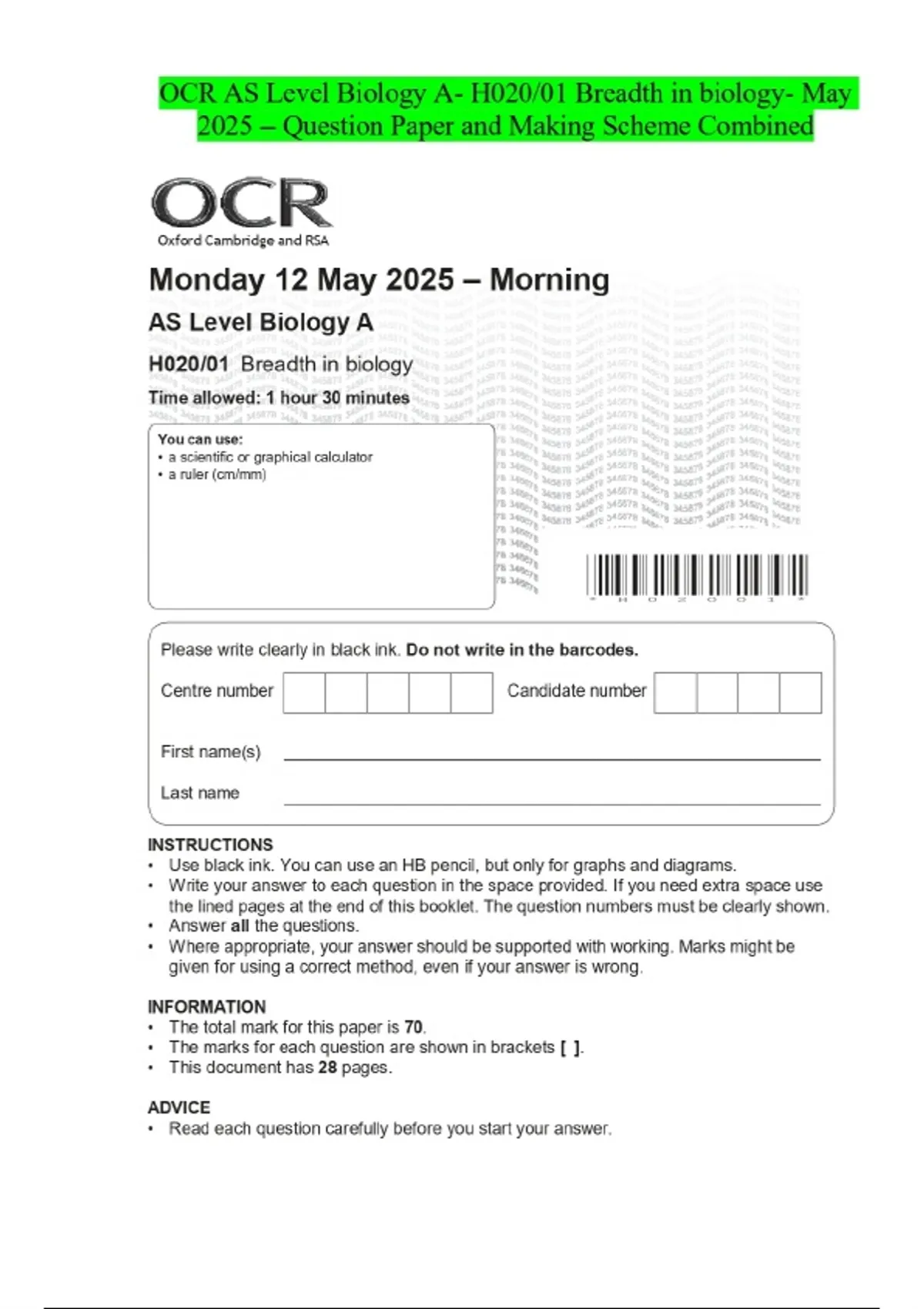 OCR AS Level Biology A- H422/03 Practical skills in biologyJune 2025 – Question Paper and Making Scheme Combined