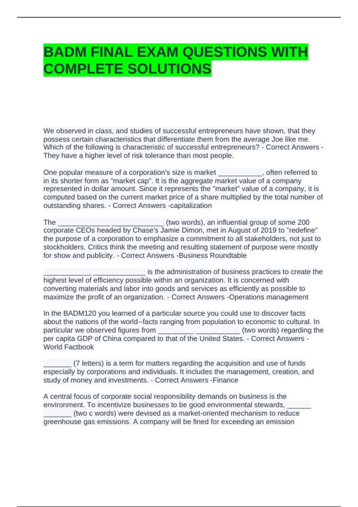 BADM FINAL EXAM QUESTIONS WITH COMPLETE SOLUTIONS