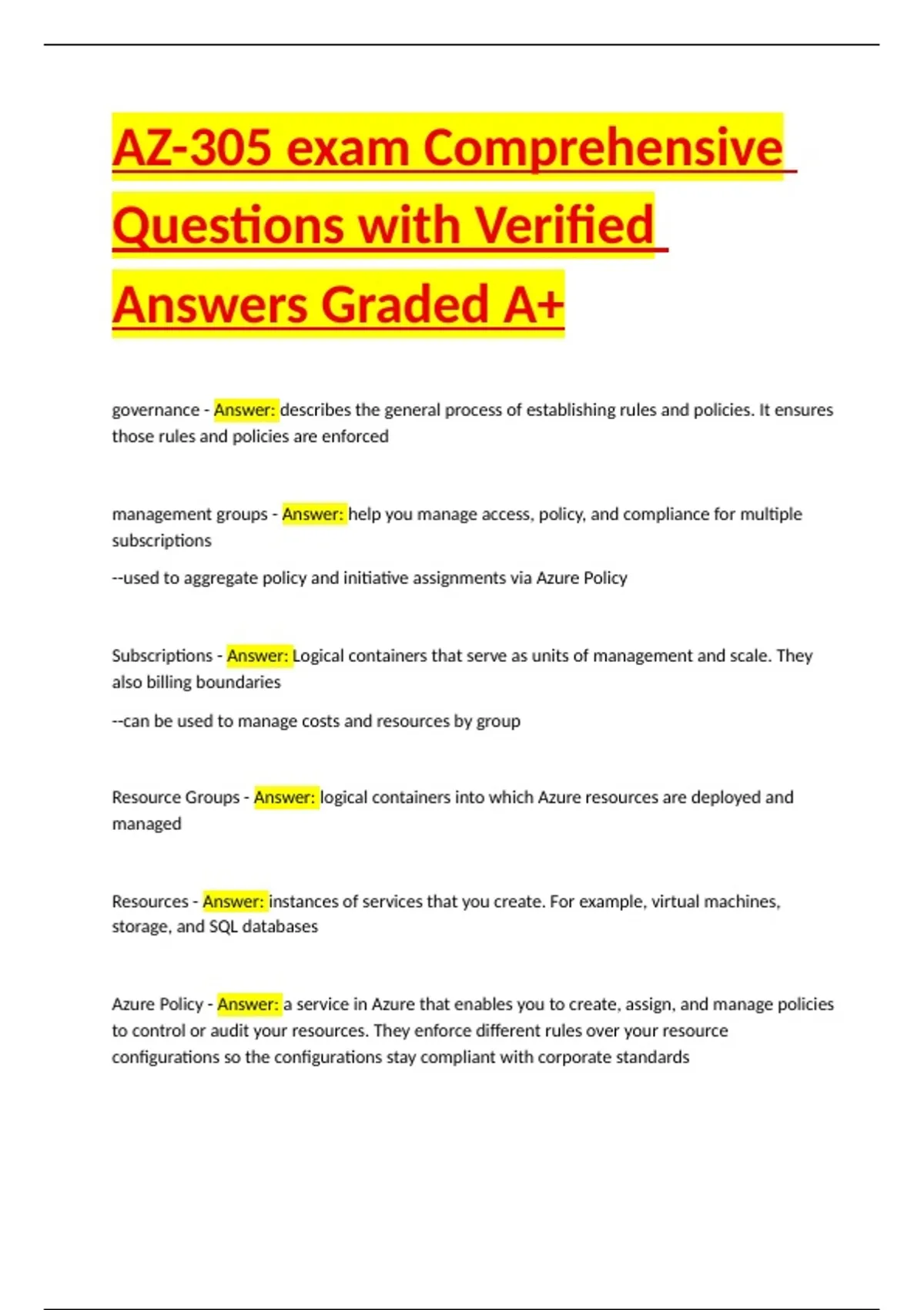 Resource Groups - Answer: logical containers into which Azure resources are deployed and