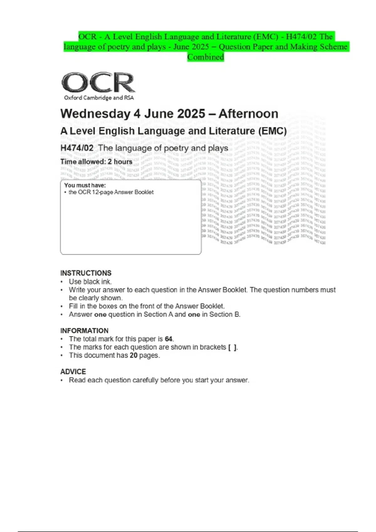 OCR - A Level English Language and Literature (EMC) - H474/03 Reading as a writer, writing as a reader- June 2025 – Question Paper and Making Scheme Combined