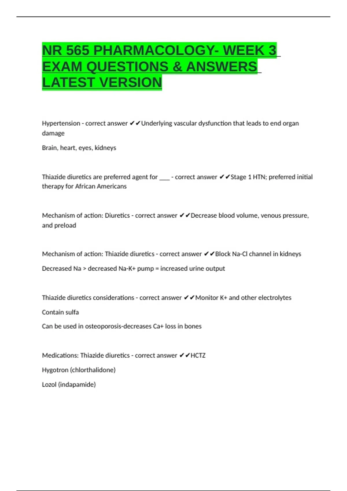 ,Side effects: Thiazide diuretics - correct answer ✔✔Hyperglycemia, hyperuricemia,